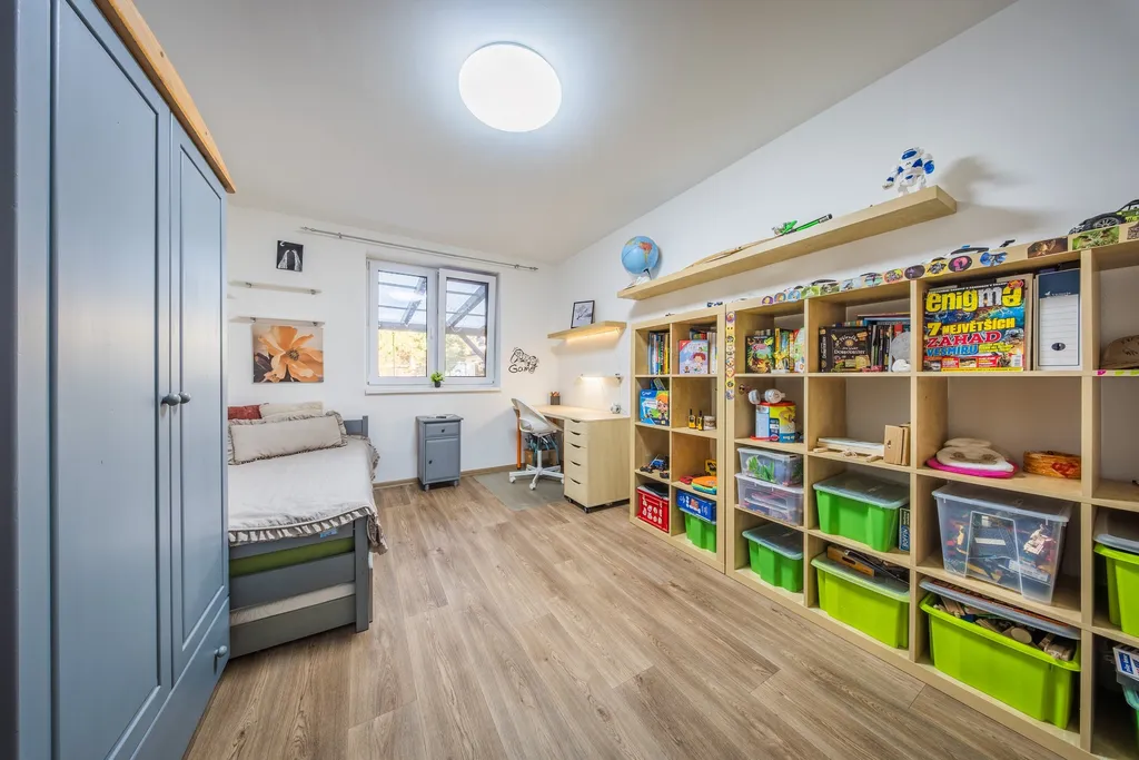 Velkou výhodou je také přístup na pozemek nejen z přední části domu, ale i z boční strany samostatnou branou, což oceníte například při manipulaci se dřevem, zahradní technikou nebo při údržbě zahrady – není tedy nutné procházet přes dům.