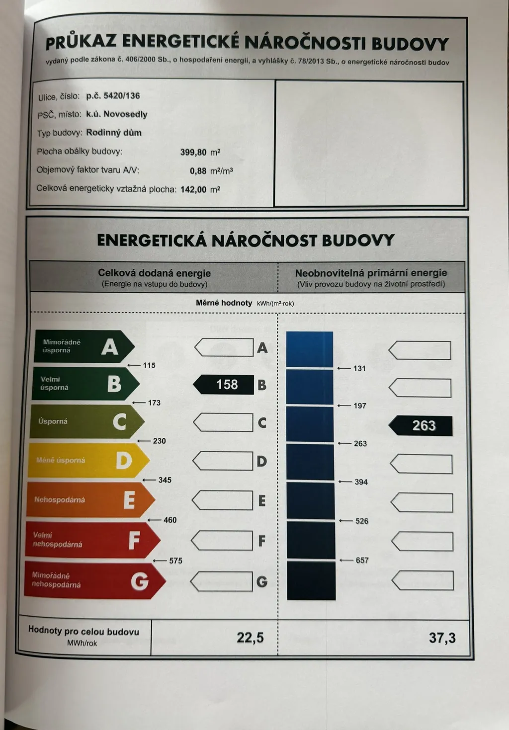| Ukazatel energetické náročnosti | 158 kWh/m2 za rok |