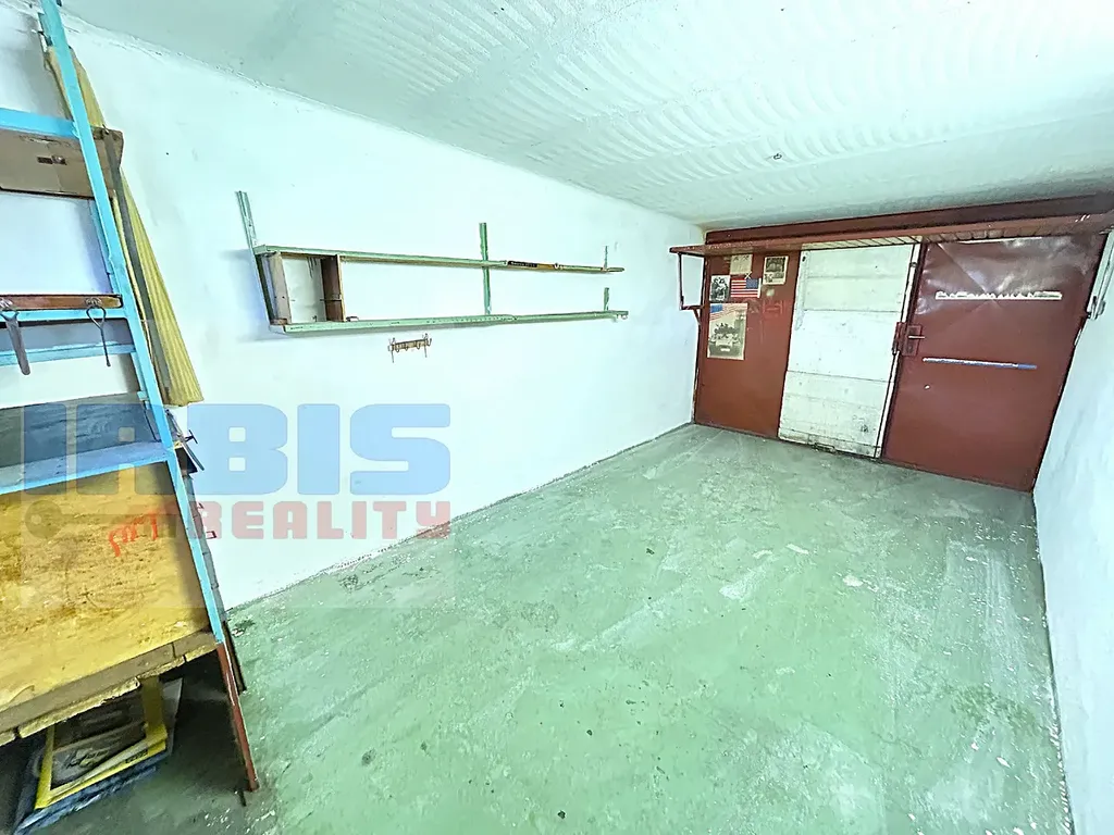 Garáž o rozměrech cca. 2.80 x 5.28 m s výškou stropu 2.10 – 2.41 m (vjezd do garáže šíře 1.85 m a výška 2.73 m) má toto vybavení: vysoký kovový regál s šuplíky, zářivkové osvětlení, úložný prostor cca 0,25 x 2,82 cm nad vstupem do garáže, věšáky, zrcadlo, 2x dřevěná police.