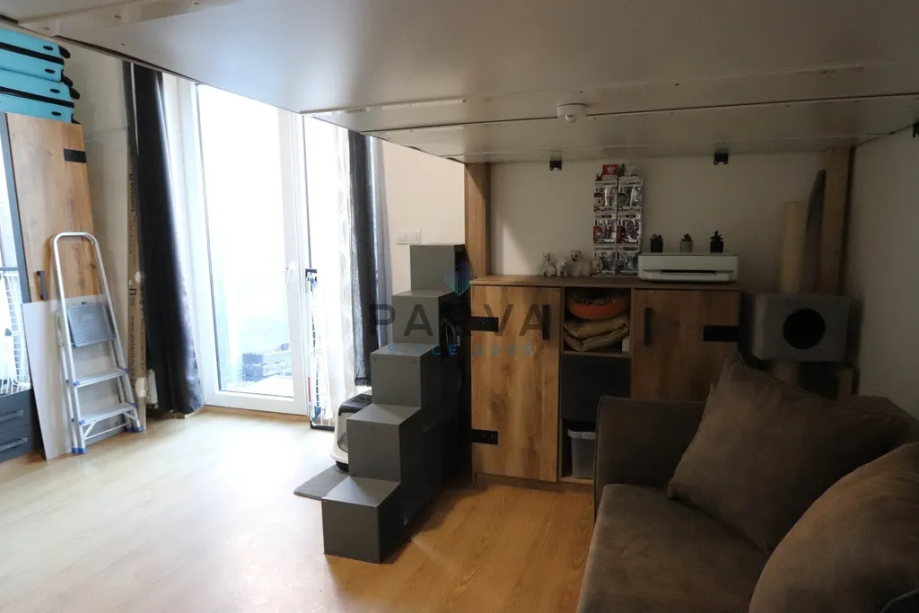 V bytě se nachází menší chodba . Po pravé straně je zděné sociální zařízení - umyvadlo, sprchový kout a WC dále prostor na pračku a sušičku. V pokoji se nachází po levé straně kuchyňský kout s novou moderní kuchyňskou linkou do tvaru U s imitací lamina. V lince jsou vestavěné spotřebiče - elektrická trouba, mikrovlnná trouba, myčka , sklokeramická deska a digestoř ( součást prodeje ) . Po pravé straně vyvýšená postel - palanda . Pod dvoulůžkovou postelí se nachází sedací souprava a po levé straně obývací stěna se skříní. Dominantou bytu - pokoje - jsou francouzské dveře vedoucí na terasu k relaxaci ale i k pěstovaní květin či zeleniny.