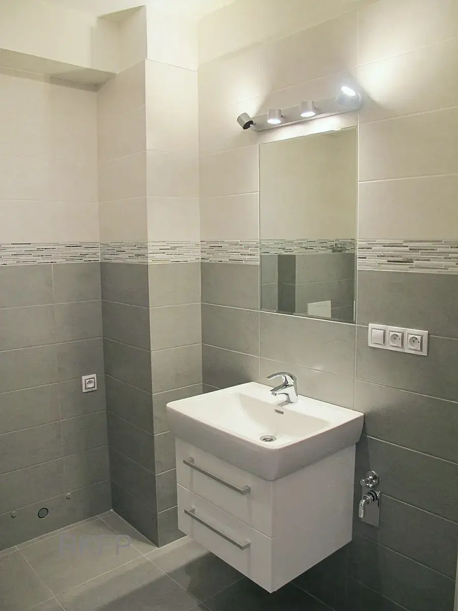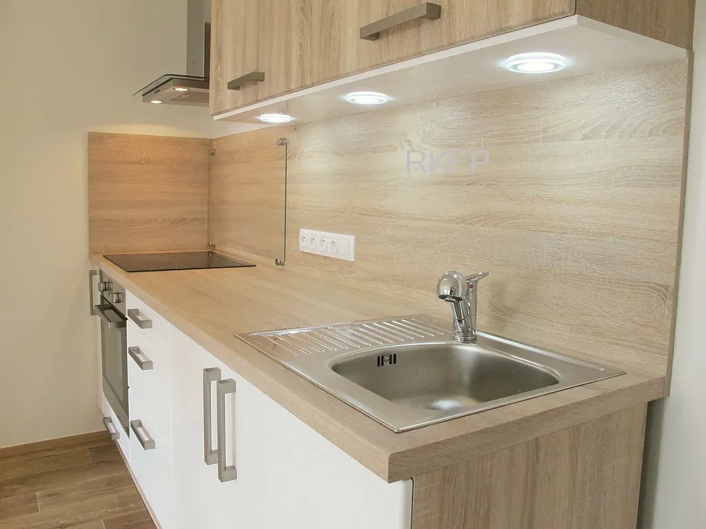 Byt se pronajímá nezařízený, je v něm pouze kuchyňská linka s myčkou nádobí, elektrickým sporákem se sklokeramickou varnou deskou a pečicí troubou, digestoří a integrovaným LED osvětlením. Kuchyňský kout s přilehlou úložnou komorou je oddělený barem s LED osvětlením od obývacího pokoje, který je spolu s jedním dalším pokojem orientovaný do ulice, na jižní stranu domu. Díky tomu jsou oba tyto pokoje, které propojuje kromě dveří i velmi prostorný venkovní balkón, velmi světlé. Třetí obytná místnost se nachází na druhém konci bytu a je orientována do zahrady, na severní stranu. Byt má moderní koupelnu s umyvadlem s LED osvětlením, velmi prostorným sprchovým koutem vybaveným termostatickou baterií a klasickou ruční i zabudovanou dešťovou sprchou, WC a přípojkou na pračku.