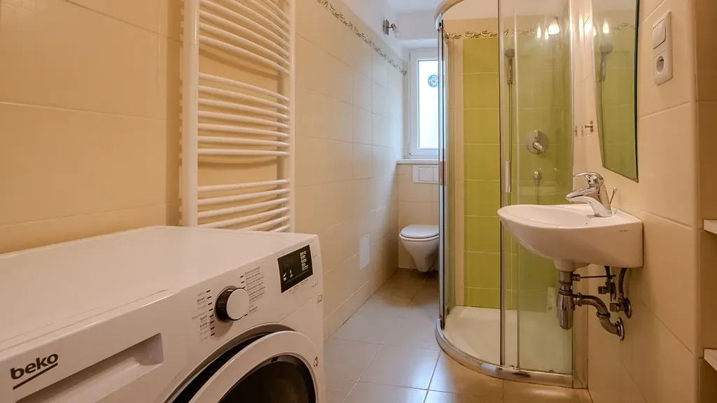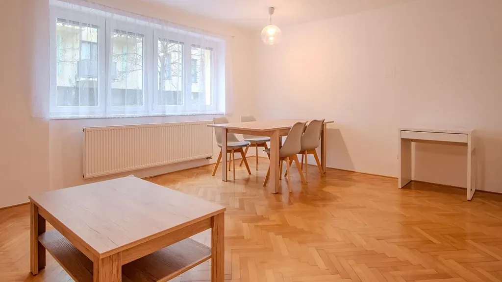 Byt je zděný a velmi dobře odhlučněný, okna jsou orientována jak do ulice, tak do vnitrobloku se zelení, takže zde najdete dostatek světla, soukromí i klidu. Byt se pronajímá plně vybavený, kromě sedací soupravy a postele v ložnici, takže je připravený k okamžitému nastěhování. Součástí vybavení je: kuchyňská linka se spotřebiči (plynový sporák, elektrická trouba, lednice s mrazákem, myčka a mikrovlnná trouba), v obývacím pokoji: obývací stěna, jídelní stůl, židle + konferenční stolek. Do koupelny je šikovně umístěna pračka i sušička + sprchový kout a wc. Součástí pronájmu je také sklepní kóje a možnost využívání společných prostor domu. Velkým bonusem je venkovní prostor za domem s místem k posezení i dětským hřištěm. Tento byt je ideální volbou pro ty, kteří hledají klidné, pohodové a bezpečné bydlení a přitom chtějí mít vše potřebné na dosah.
