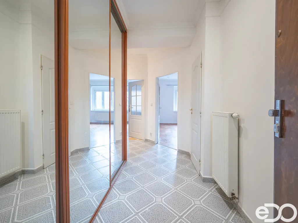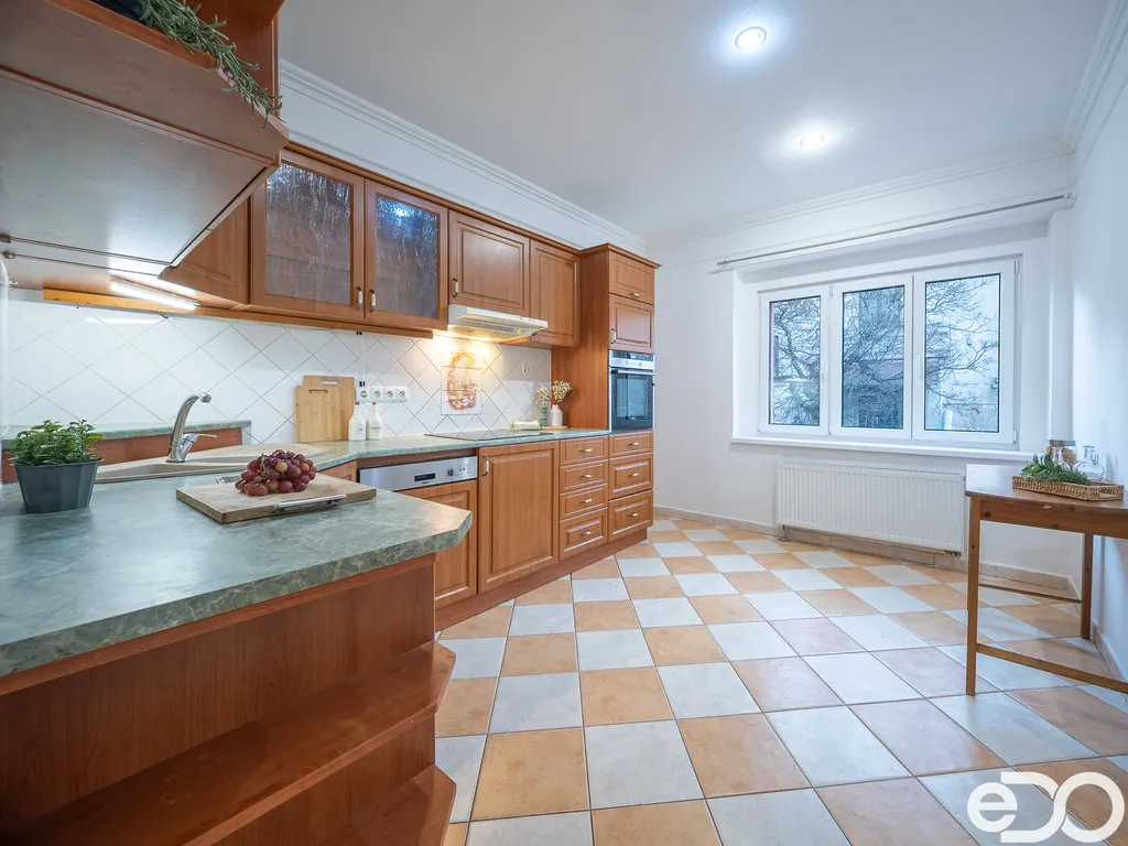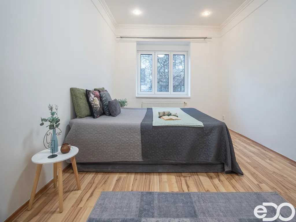 Obývací pokoj působí vzdušně a příjemně díky velkým oknům, která přivádějí dostatek denního světla po celý den. Zachovalé parkety v klasickém vzoru dodávají interiéru přirozené teplo a charakter. Ložnice je samostatná a klidná, což poskytuje dostatek soukromí pro spánek i odpočinek.
