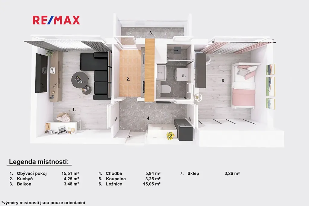 Výměry jednotlivých místností pak můžete nalézt v přiloženém půdorysu. Kromě zmíněných obytných místností je samozřejmostí i kuchyně se vstupem na prostorný balkon a koupelna s toaletou. To celé doplněno ještě o větší chodbu/předsíň při vstupu do bytu. A samozřejmě nesmí chybět sklep v přízemí domu o výměře cca 3.26 m2.