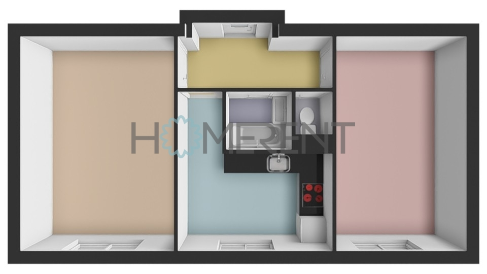 Dispozičně je byt řešen velmi prakticky. Samostatná kuchyň poskytuje dostatek prostoru pro vaření i případné menší jídelní místo. Další dvě místnosti mohou sloužit například jako obývací pokoj a ložnice, případně jako ložnice a pracovna. Byt je díky své dispozici vhodný jak pro jednotlivce, tak pro pár.