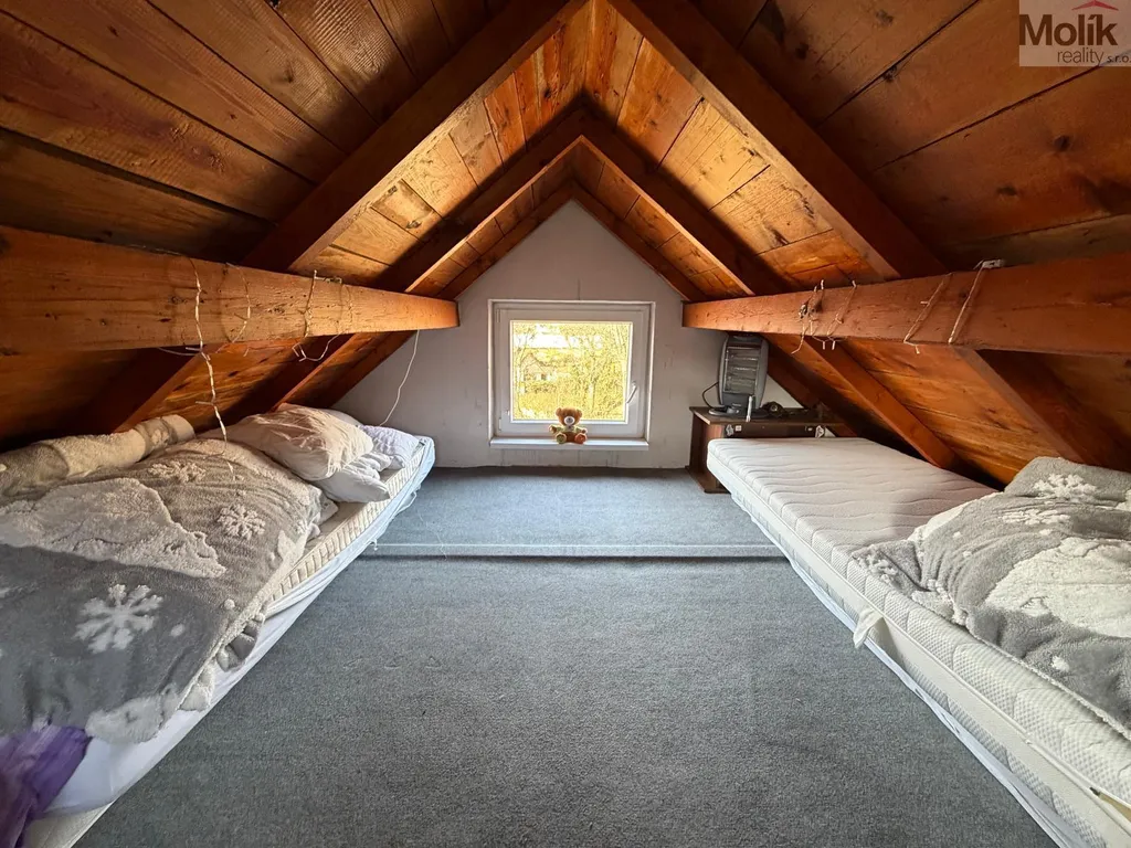 Interiér v patře tvoří světlá obytná místnost s krbem na tuhá paliva, který zajišťuje příjemné teplo i v zimních měsících. Nad obytnou částí je k dispozici útulné spací podkroví, které efektivně odděluje klidovou zónu od denního provozu.
