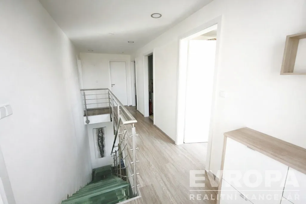 Dům nabízí prakticky řešenou dispozici – v přízemí se nachází prostorný obývací pokoj s kuchyňským koutem, odkud je přímý vstup na zahradu, samostatná toaleta a chodba. V patře najdete čtyři samostatné pokoje, dvě koupelny a technickou místnost. Z garáže je přímý vstup na zahradu. Dispozice domu tak poskytuje dostatek prostoru jak pro rodinné soužití, tak pro práci z domova. Podlahové vytápění a další technologie jsou samozřejmostí.