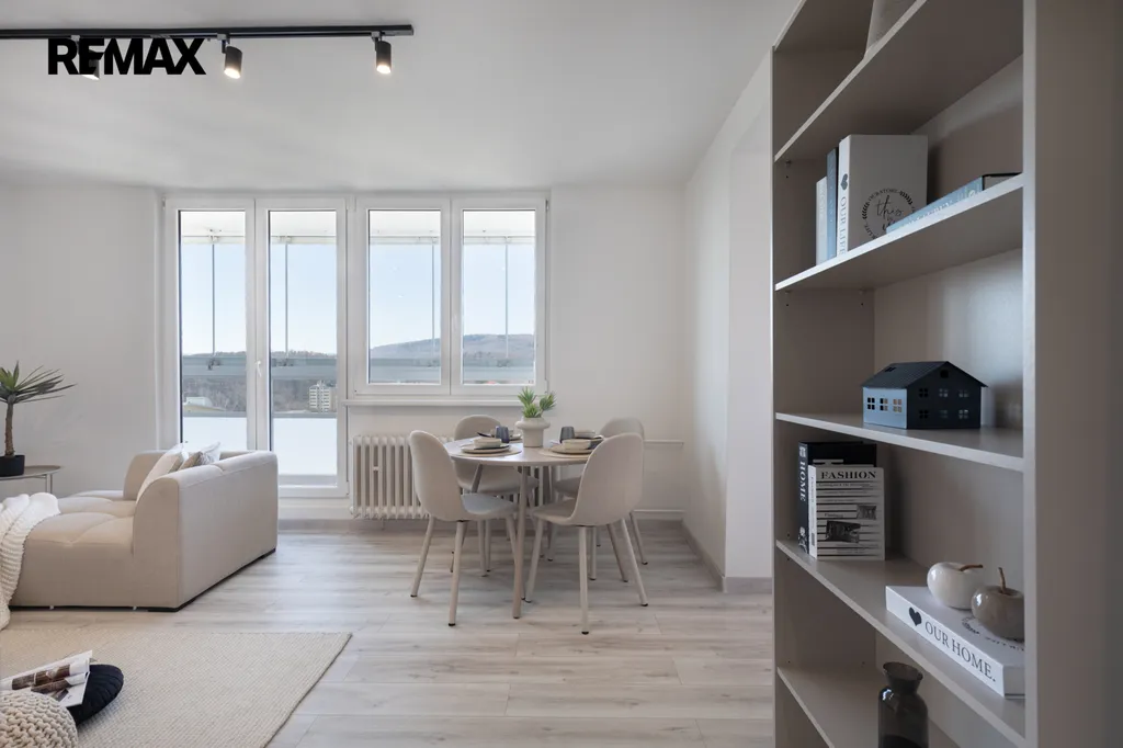 Nabízíme k prodeji komfortní designový byt v moderních tónech světle béžové po kompletní právě dokončené rekonstrukci 3+1 s velkou a malou zasklenou lodžií v osobním vlastnictví o užitné ploše 67,2 m² / byt 61,1 m2, lodžie velká 4,5 m2, lodžie malá 1,6 m2 + sklepní koje jako další prostor ( není započten v užitné ploše ) v klidné a vyhledávané lokalitě Meziboří, J.A.Komenského 324. Při rekonstrukci byly použity jen kvalitní materiály. K bytu náleží sklep. Byt se nachází v 6. nadzemním podlaží zatepleného domu s výtahem. / vnitřní příčky cihla /