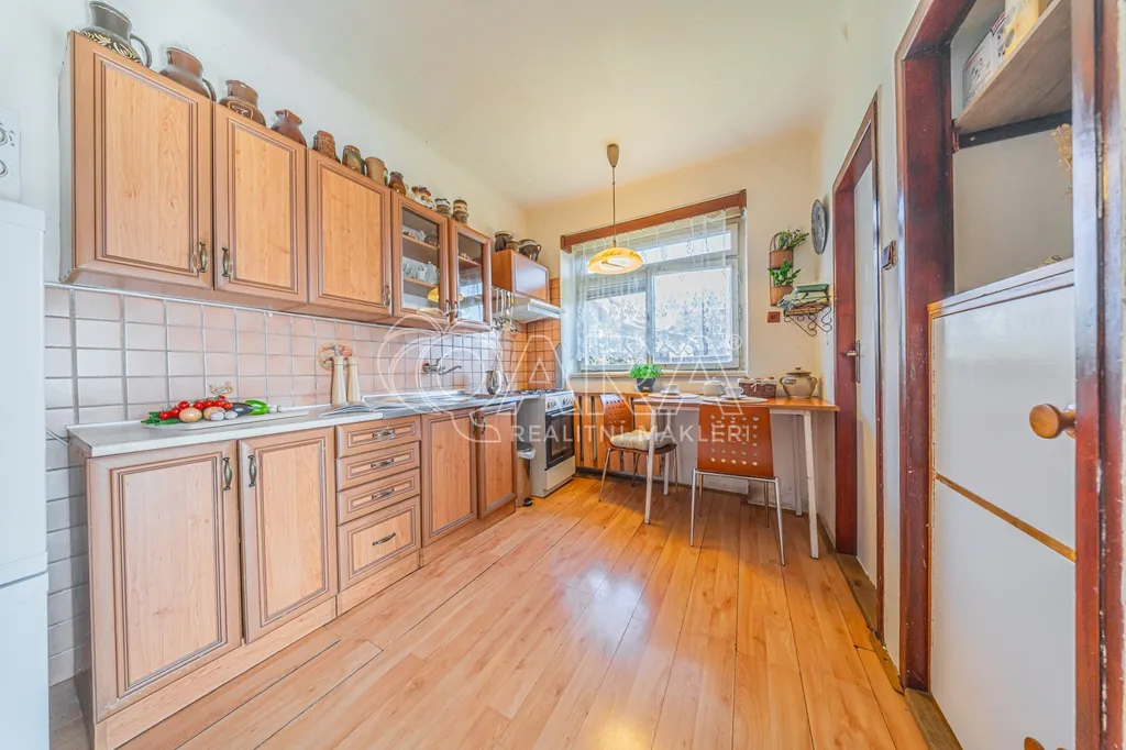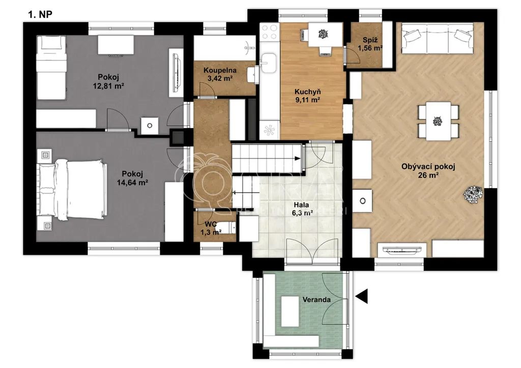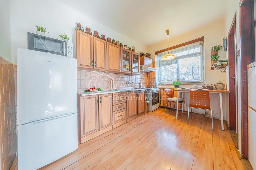 Vstup do domu je přes prosklenou verandu, jejíž atmosféra přímo vybízí k vybudování zimní zahrady. Na ni navazuje chodba, ze které se vstupuje do samostatné kuchyně s praktickou špajzkou. Z kuchyně je dále přístup do obývacího pokoje orientovaného na jižní stranu.