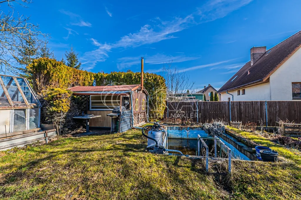 Venkovní zázemí domu doplňují funkční kolny, garáž a zastřešené prostory za domem, které lze nadále využívat nebo je odstranit a otevřít tak zahradu pro další využití podle vlastních představ.