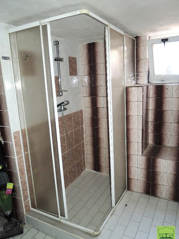 Vstup do chodby, z níž jsou vstupy do pokoje v přízemí, s výhledem do předzahrádky, do kuchyně s výhledem do vlastní zahrady, vstup do spižírny, WC, a dále po několika schodech dolů vstupujeme na terasu, na niž navazuje vlastní zahrada se zahradním domkem. Vedle dveří na terasu je vstup po schodech do rozměrné koupelny v suterénu se sprchou i vanou a sekčními prostory pro pračku, kotel na ohřev teplé vody a plynový kotel. Nelze zapomínat také na 2 sklepní prostory.