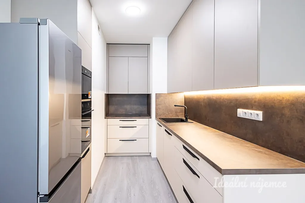 Interiér je nabízen jako nezařízený, což vám otevírá prostor pro realizaci vlastních představ o ideálním domově. Srdcem bytu je prostorný obývací pokoj s dostatkem přirozeného světla, který volně navazuje na moderní kuchyňský kout. Ten je kompletně vybaven kvalitními spotřebiči včetně lednice s mrazákem, elektrické a mikrovlnné trouby, varné desky, myčky a digestoře. Druhý, samostatný pokoj nabízí variabilní využití jako ložnice, dětský pokoj nebo klidná pracovna. Koupelna disponuje vanou, umyvadlem se skříňkou a toaletou, přičemž v bytě naleznete i praktickou technickou místnost s pračkou, která skvěle poslouží jako komora či sušárna.