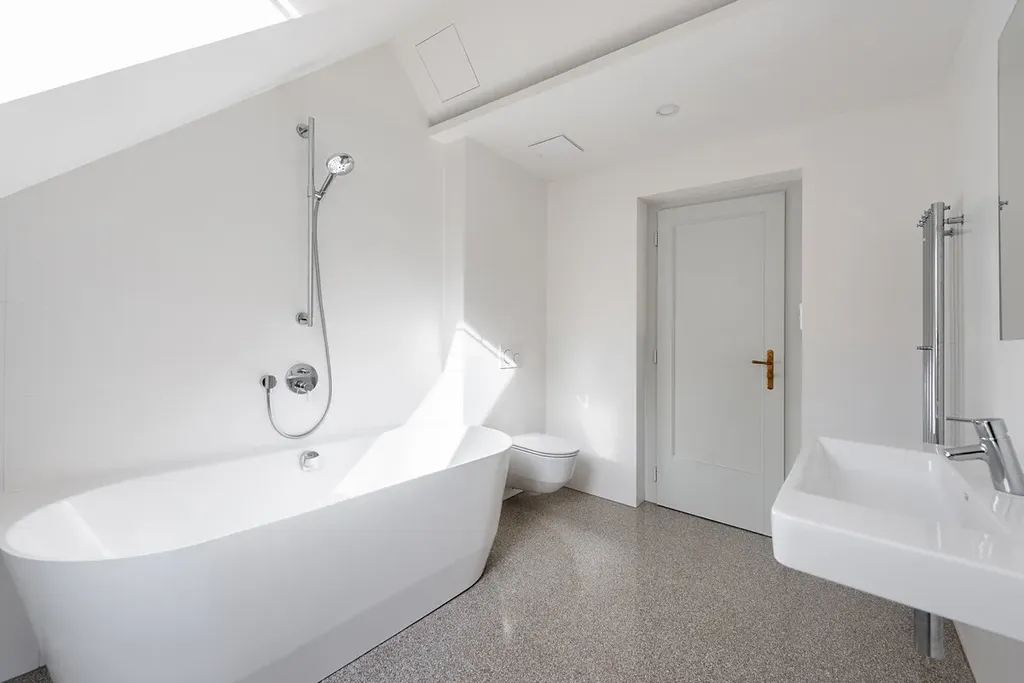 Dispozice bytu ve třetím nadzemním podlaží je koncipována s důrazem na velkorysost a jasnou prostorovou logiku. Dominantou je propojený obytný prostor orientovaný do klidového vnitrobloku, připravený pro instalaci kuchyně i krbu. Na hlavní obytnou část navazuje jižně situovaná terasa a lodžie, které přirozeně rozšiřují životní prostor do exteriéru. Součástí bytu jsou tři promyšleně umístěné pokoje s dostatkem soukromí a dvě koupelny. Jedna z koupelen se vyznačuje kultivovaným řešením s volně stojící vanou umístěnou u okna, kde přirozené světlo zvýrazňuje kvalitu použitých materiálů i celkový architektonický výraz. Druhá koupelna se sprchovým koutem, elegantně začleněná do místa původní lodžie, otevírá přímý vstup na balkon a nabízí autentický výhled do jedné z nejpůvabnějších uliček Starých Střešovic.