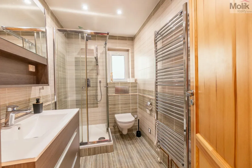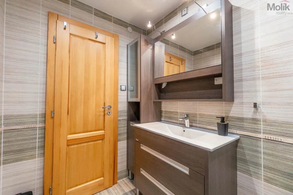 V 1. nadzemním podlaží se nachází bytová jednotka 3+kk s koupelnou. V tomto podlaží byly provedeny nové rozvody elektřiny, topení a vody včetně odpadů.