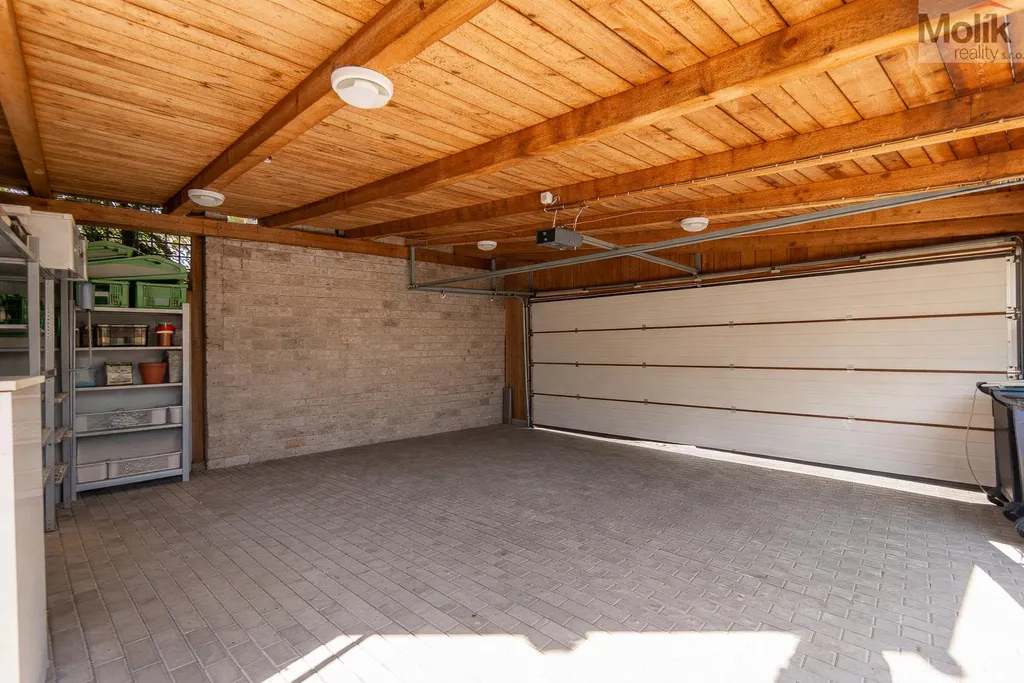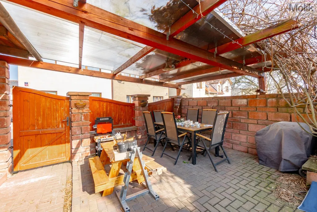 K nemovitosti náleží zahrada o výměře 275 m2, na které se nachází pergola pro příjemné posezení, dílna na nářadí a velká garáž se sekčními vraty na dálkové ovládání.