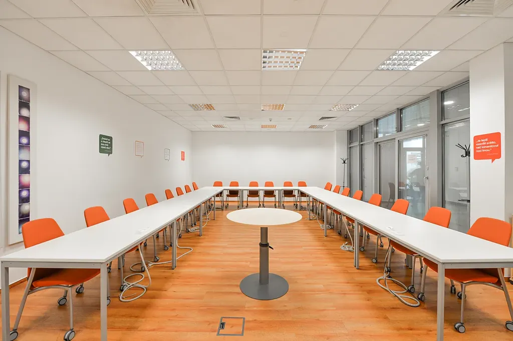 V budově naleznete veškeré zázemí ve formě sdílených zasedacích místností, fitness, kolárny, včetně zázemí se sprchami a šatnami.