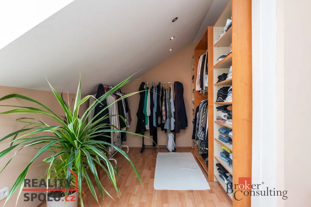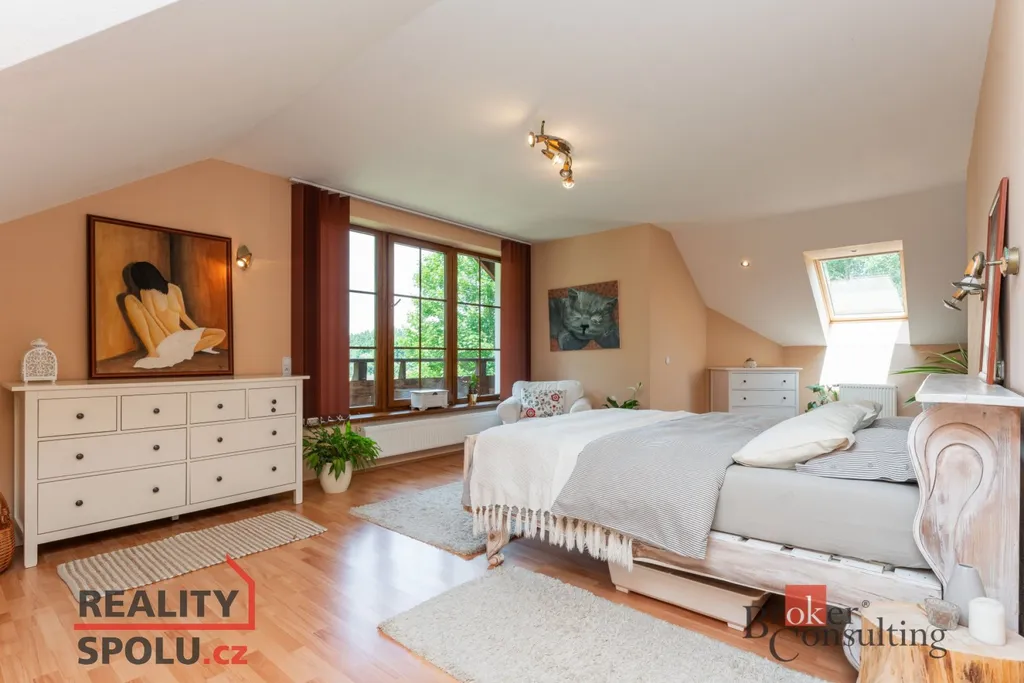 V 1. patře se dále nachází ložnice s šatnou (26,68 m² + 14,53 m²) a výhledem do zelené krajiny. Součástí 1. patra je dále chodba (11,68 m²), pokoj (24,56 m²), koupelna s toaletou (13,62 m²) a dětský pokoj (19,01 m²). Nad obytnou částí se nachází půdní prostor.