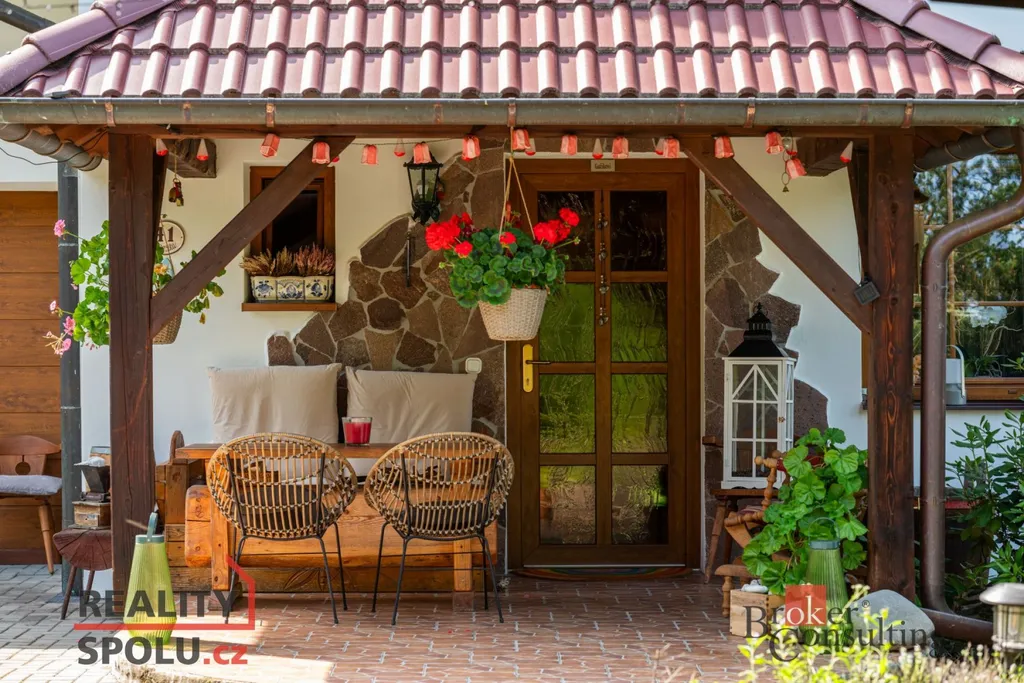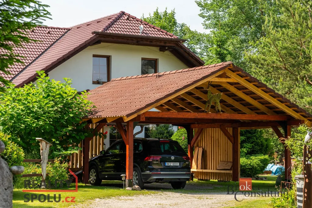 Dům obklopuje vzrostlá zeleň, která poskytuje vysokou míru soukromí. Součástí zahrady je útulná terasa s posezením a grilem, přístřešek pro parkování dvou aut a jezírko s molem.