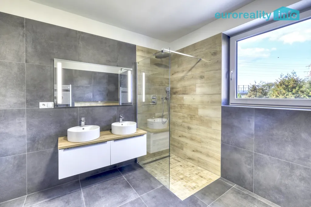 V patře jsou umístěny ložnice a další pokoje, koupelna s toaletou a vstup na horní terasu o ploše cca 18 m², která nabízí příjemný prostor pro relaxaci.