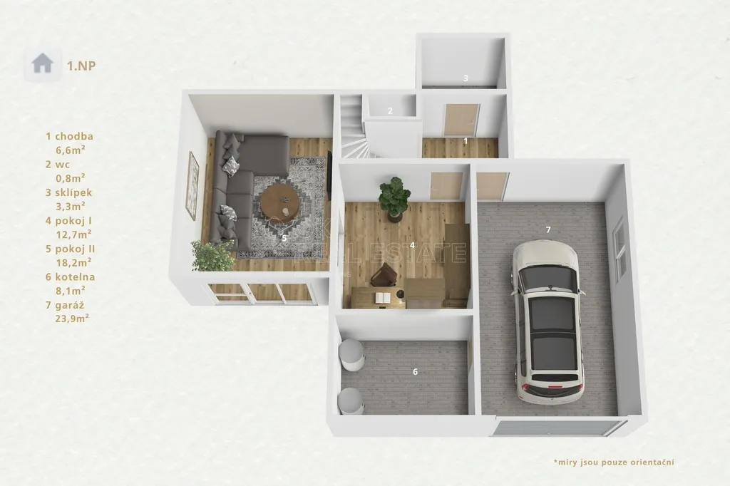 Velkorysý pozemek nabízí široké možnosti využití – od realizace zahrady, venkovního posezení či bazénu až po další úpravy podle vašich představ.