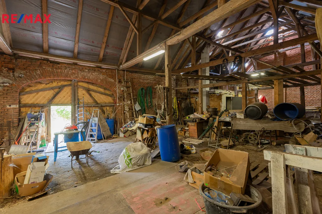 Hospodářská budova – samostatně stojící patrová stodola 178 m² - možnost přestavby na stylovou restauraci, svatební sál, ubytování nebo víceúčelovou rekreační část. Díky přiložené vizualizaci si můžete představit, jak by se dala stodola zařídit a jak by mohla vypadat. Pod stodolou se nachází prostorný sklep – ideální pro uskladnění produktů z vlastní zahrady, vína nebo kulinářských zásob. Stodola díky své velikosti, dispozici a atmosféře nabízí výjimečný potenciál pro svatby, oslavy, workshopy nebo gastronomický provoz. Přilehlá garáž/dílna.