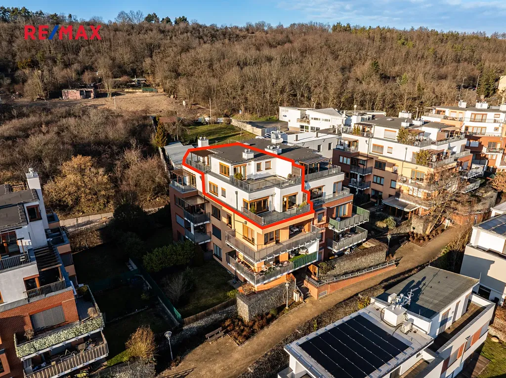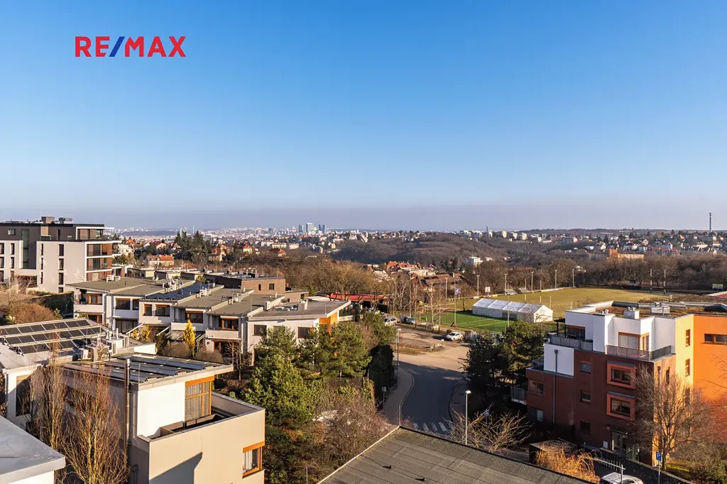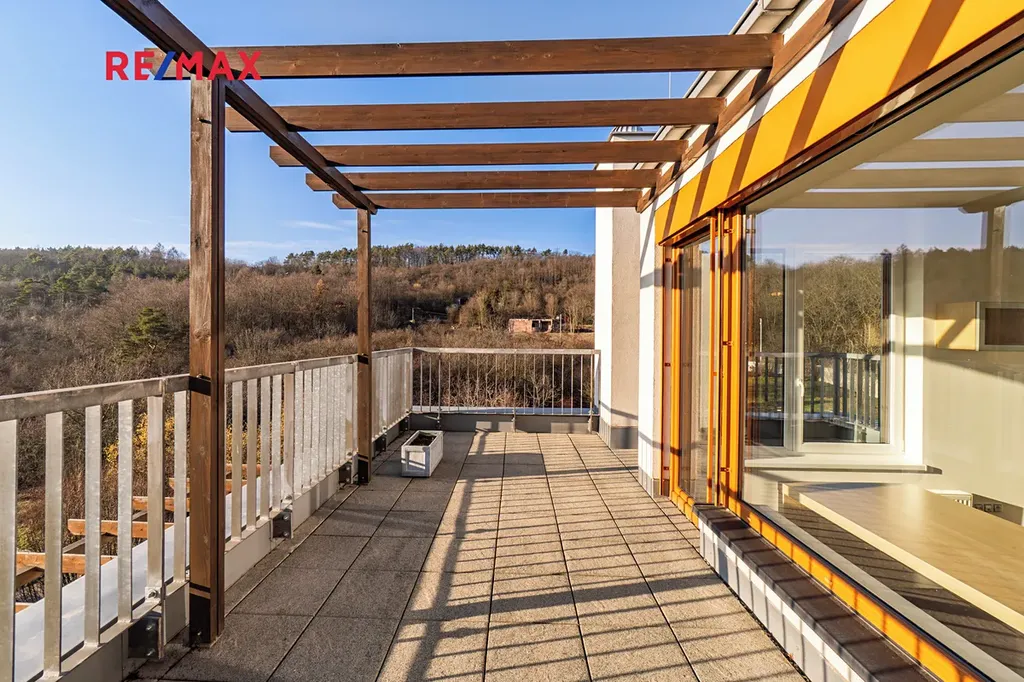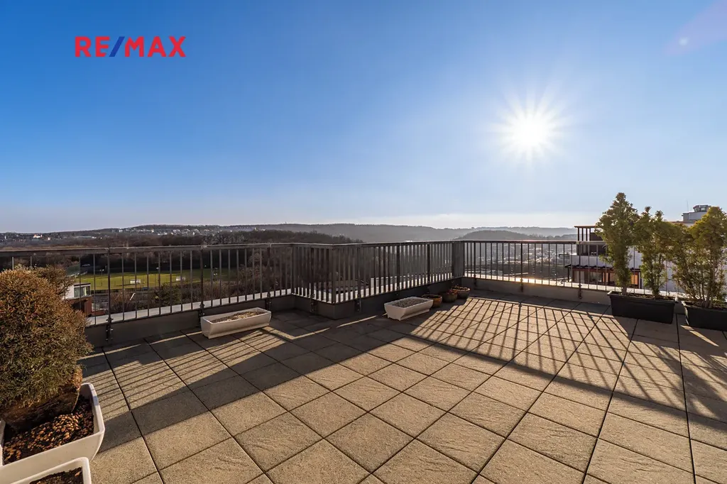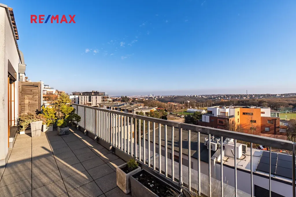 Byt se nachází ve 4. a 5. nadzemním podlaží s výtahem a nabízí celkovou obytnou plochu 116 m². Velkým benefitem jsou tři prostorné terasy o celkové výměře 86 m², které poskytují krásný výhled na panorama Prahy a ideální prostor pro relaxaci.
