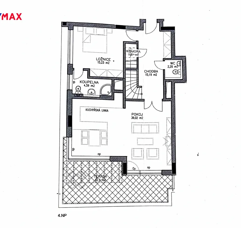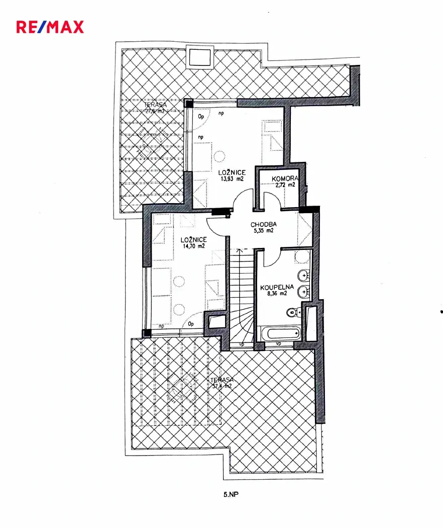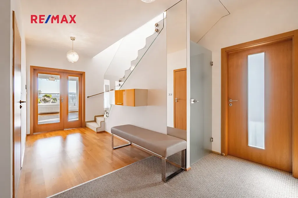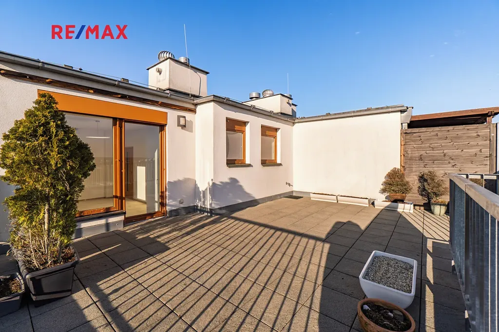 Byt se nachází ve 4. a 5. nadzemním podlaží s výtahem a nabízí celkovou obytnou plochu 116 m². Velkým benefitem jsou tři prostorné terasy o celkové výměře 86 m², které poskytují krásný výhled na panorama Prahy a ideální prostor pro relaxaci.