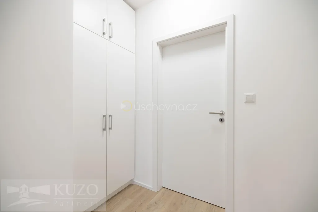 V bytě je podlahové vytápění, elegantní vinylové podlahy, rekuperace v pobytových místnostech a velkoformátová okna s trojskly.