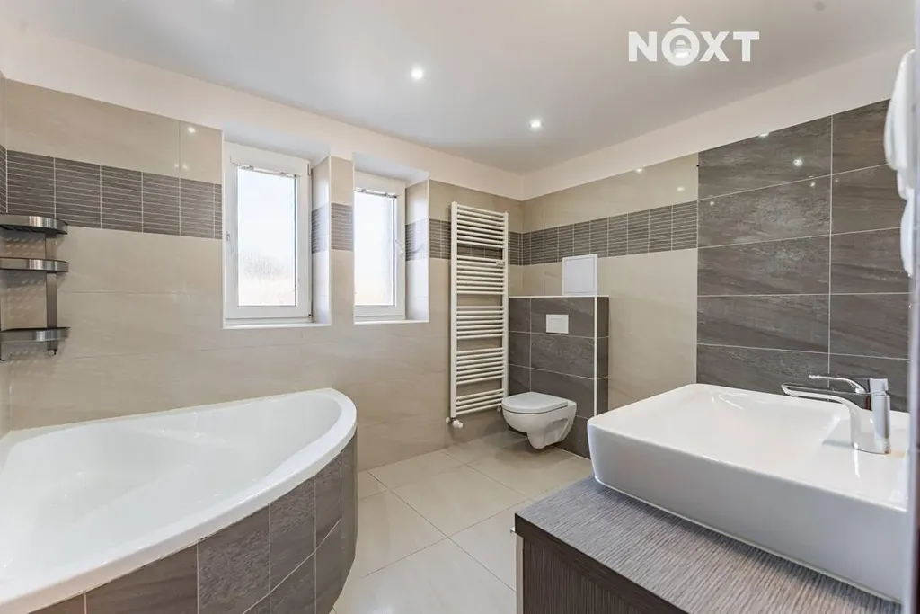 V bytě najdete koupelnu s vanou a toaletou, kde je dostatek místa pro pračku i sušičku. Dále prostornou kuchyň vybavenou moderními spotřebiči – myčkou, novou lednicí, plynovou varnou deskou a elektrickou troubou. Z chodby je také přístup do obývacího pokoje a druhého pokoje.