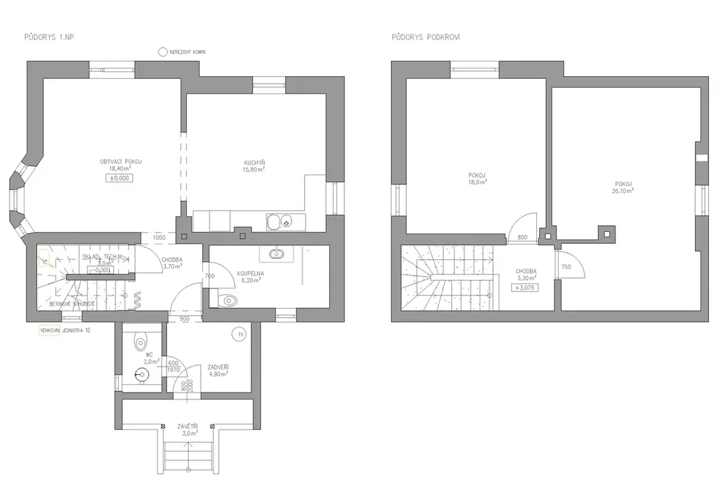 V přízemí se nachází kuchyň s jídelnou, prostorný obývací pokoj, koupelna, samostatné WC a technická místnost. V obytném podkroví jsou dvě ložnice.
