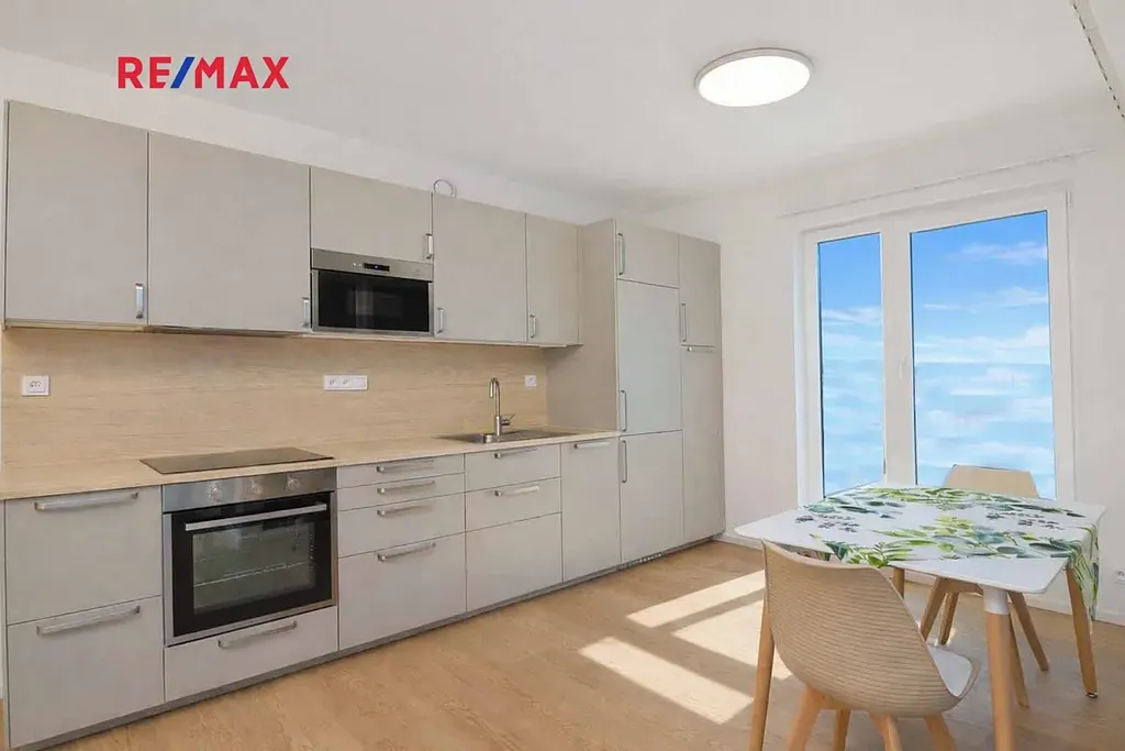 Dominantou tohoto bytu je prostorný obývací pokoj s kuchyňským koutem vybaveným moderní kuchyňskou linkou s veškerými vestavěnými spotřebiči.