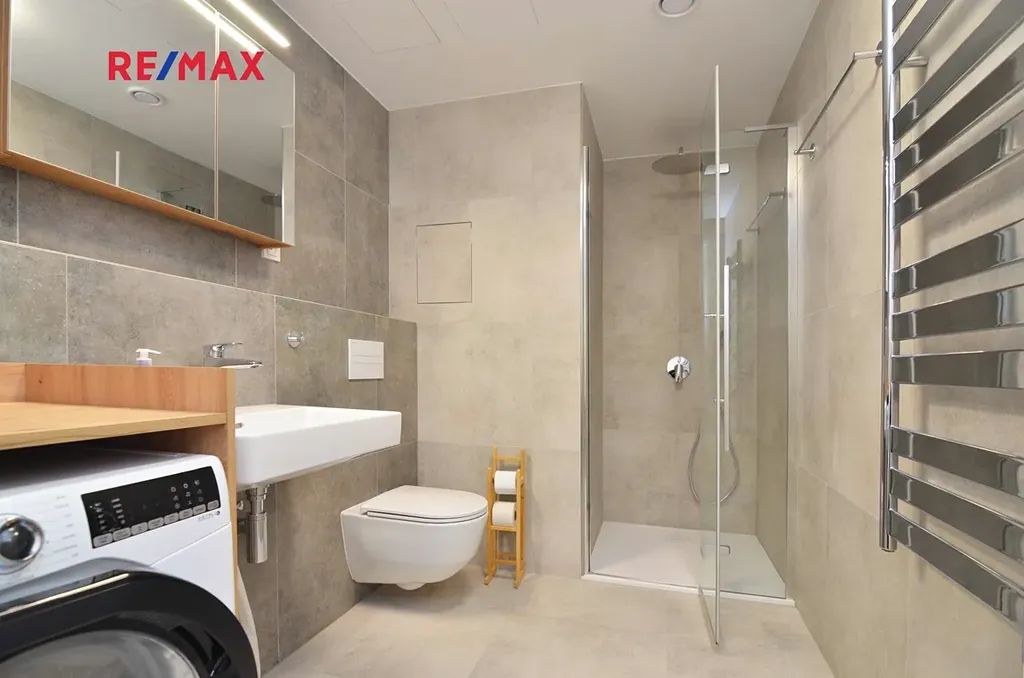 Velká koupelna se sprchovým koutem, umyvadlem, WC a pračkou se sušičkou.
