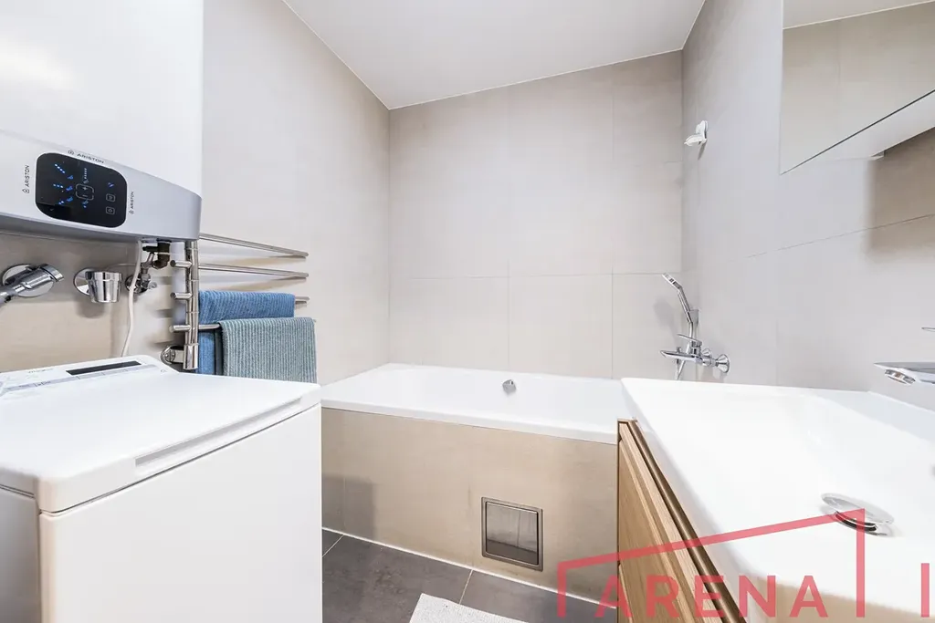 Dominantou bytu je elegantní obývací část s kuchyňským koutem, navržená v moderním a nadčasovém stylu. Kuchyňská linka na míru je osazena kvalitními spotřebiči a doplněna praktickým ostrůvkem, který podtrhuje celkový estetický dojem. Celý prostor je prosvětlený a vzdušný, navržený pro pohodlný každodenní život.