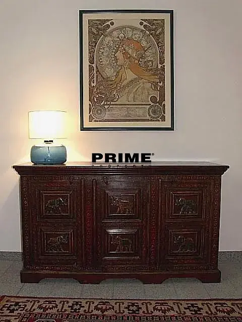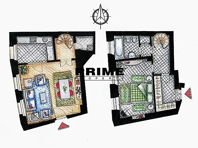 V bytě jsou gotické klenby. Byt má dva vstupy, jeden z každého podlaží. V dolní části bytu je: vstupní hala s vestavěnými skříněmi, ložnice (15m2), koupelna (vana, sprchový kout, umyvadlo, toaleta a bidet) a točité schodiště vedoucí z předsíně do horního podlaží, ve kterém je: obývací pokoj (35m2) s jídelní částí, plně vybavená kuchyň se spotřebiči (sporák, lednice s mrazákem a myčka) a komora. Na podlaze jsou parkety a dlažba s orientálními koberci. K dispozici je TV, satelit a pračka se sušičkou.