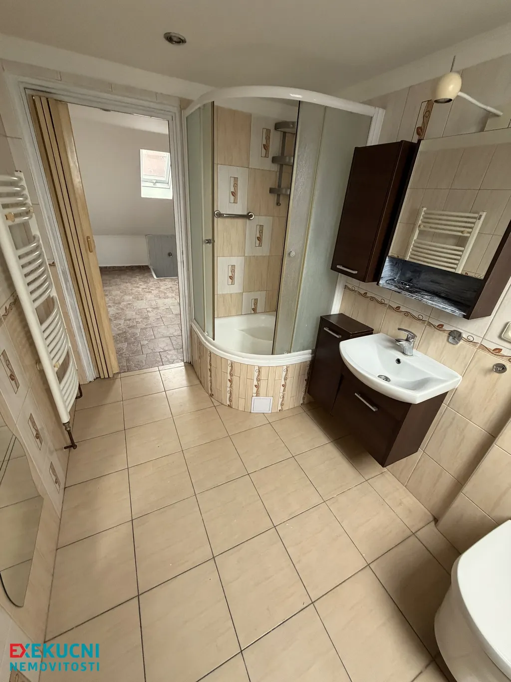 V patře pak dva opravdu velké pokoje, každý s vlastní terasou, a koupelna se sprchovým koutem a WC.