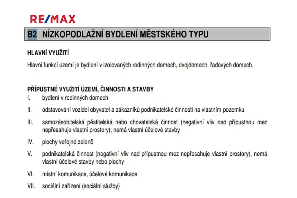 Dle územního plánu je pozemek vedený v zóně B2 nízkopodlažní bydlení. Hlavní funkcí území je bydlení v rodinných domech, případně dvojdomech či řadových domech. Stavby a jejich využití musí splňovat požadavky na rodinné bydlení se soukromými zahradami.