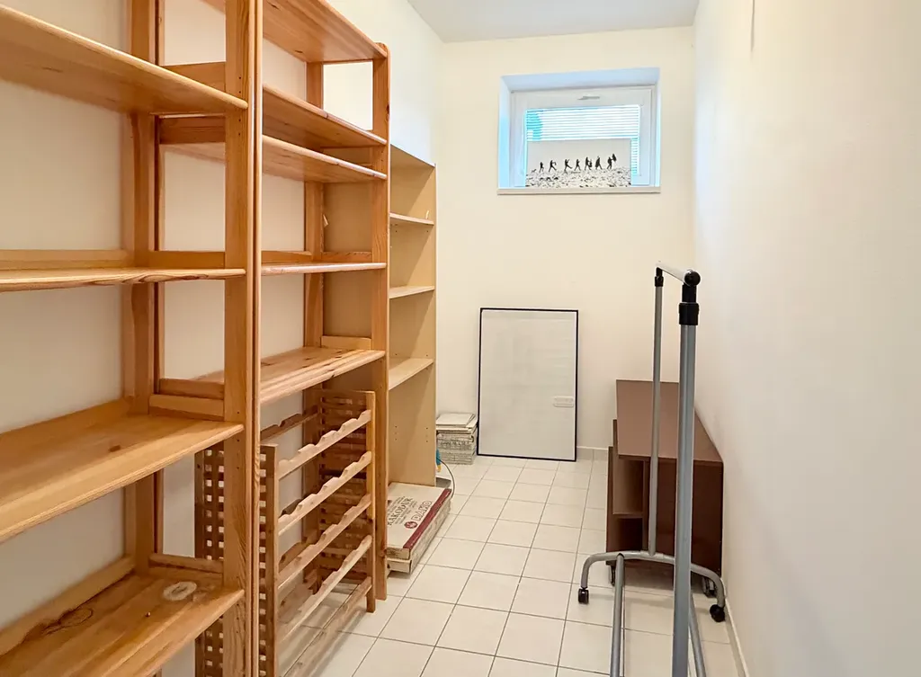 Koupelna je nadstandardně prostorná, s denním světlem a praktickým řešením úložných prostor. Samostatná toaleta zvyšuje komfort bydlení.
