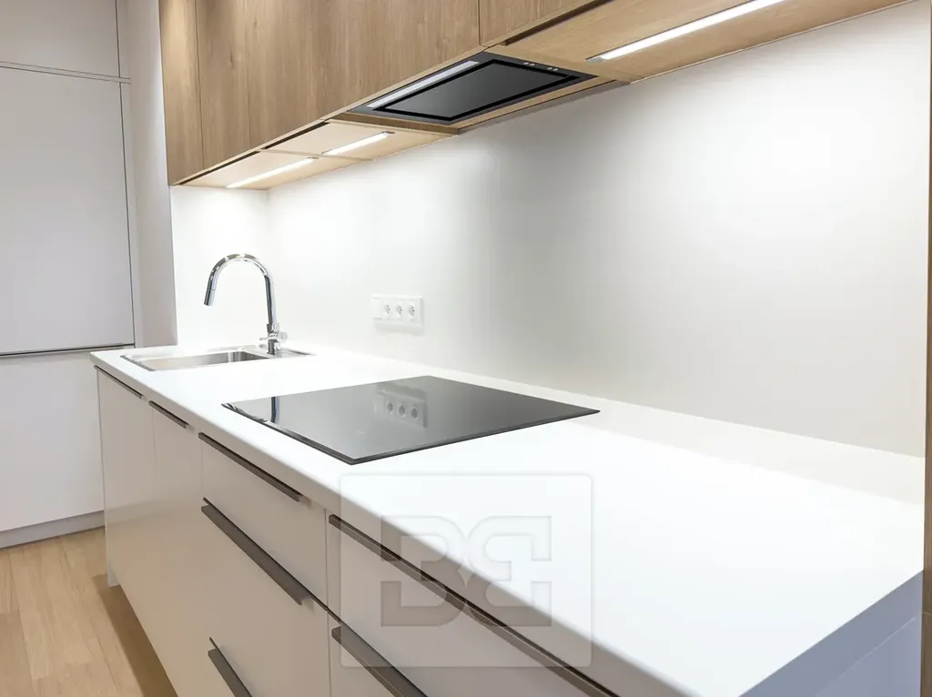 Byt je vybaven moderní prostornou kuchyňskou linkou se spotřebiči (lednice s mrazákem, indukční deska, trouba, digestoř, myčka) a spoustou úložného prostoru.