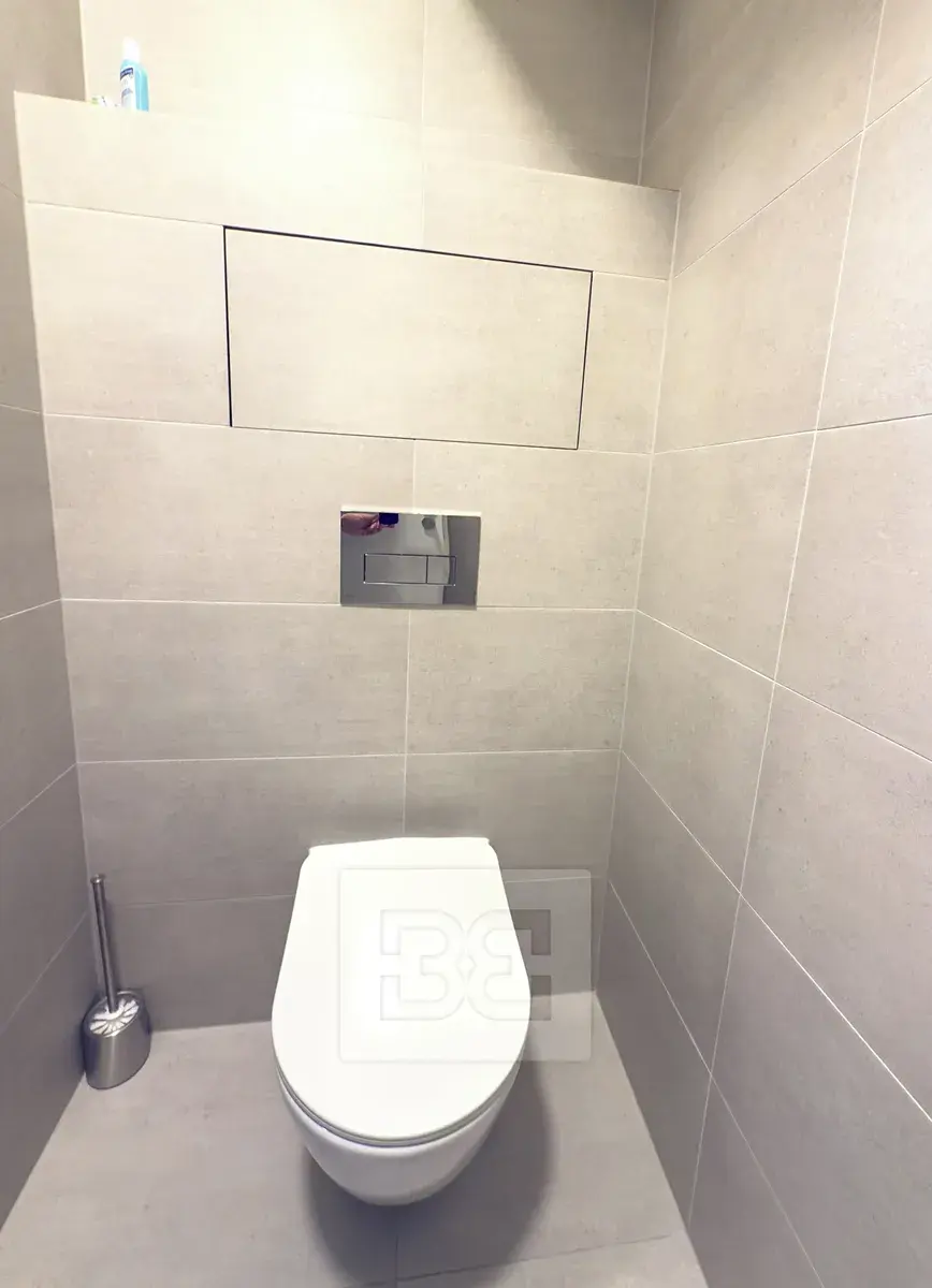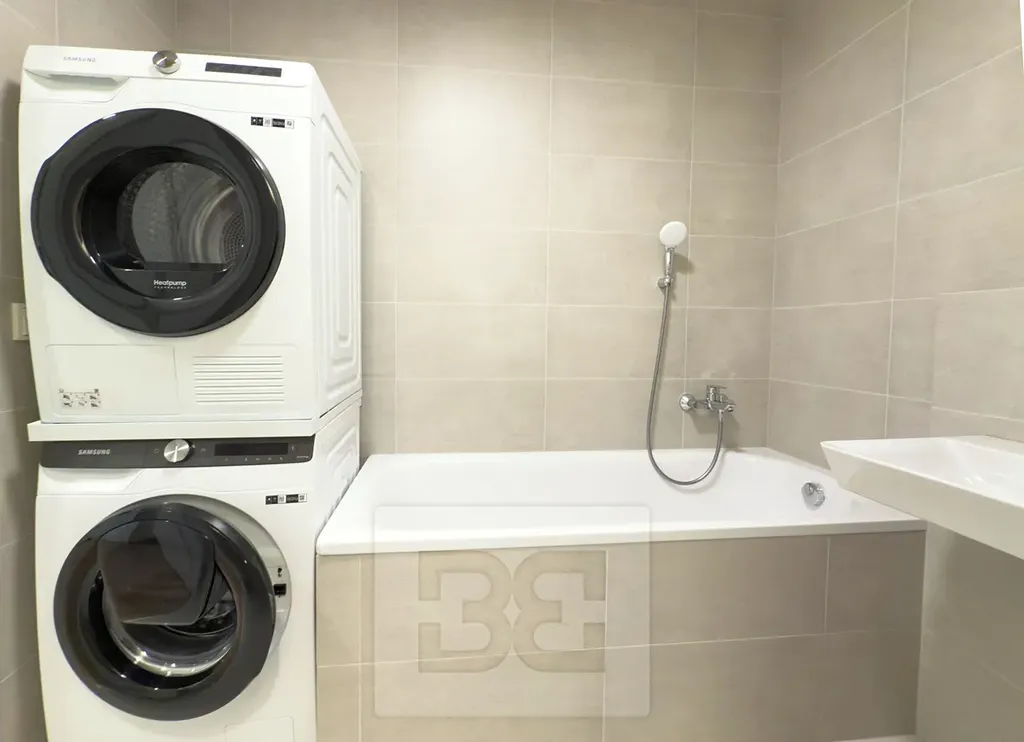 V koupelně najdeme vanu, pračku a sušičku. Toaleta je umístěna za koupelnou.