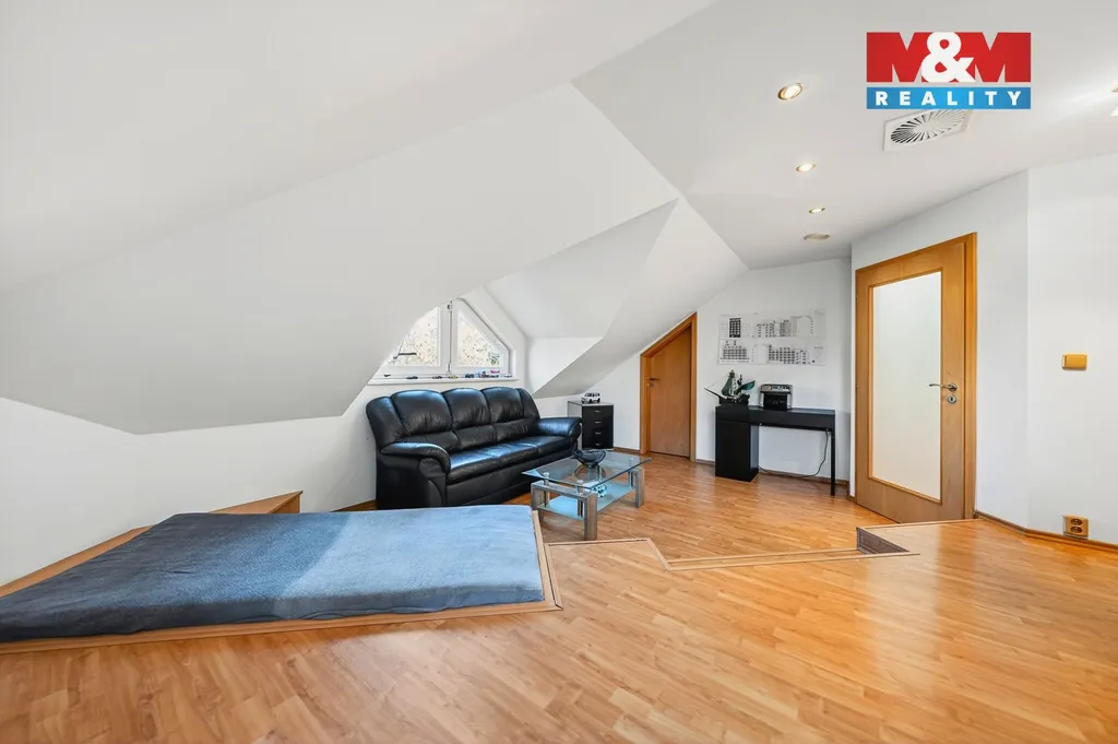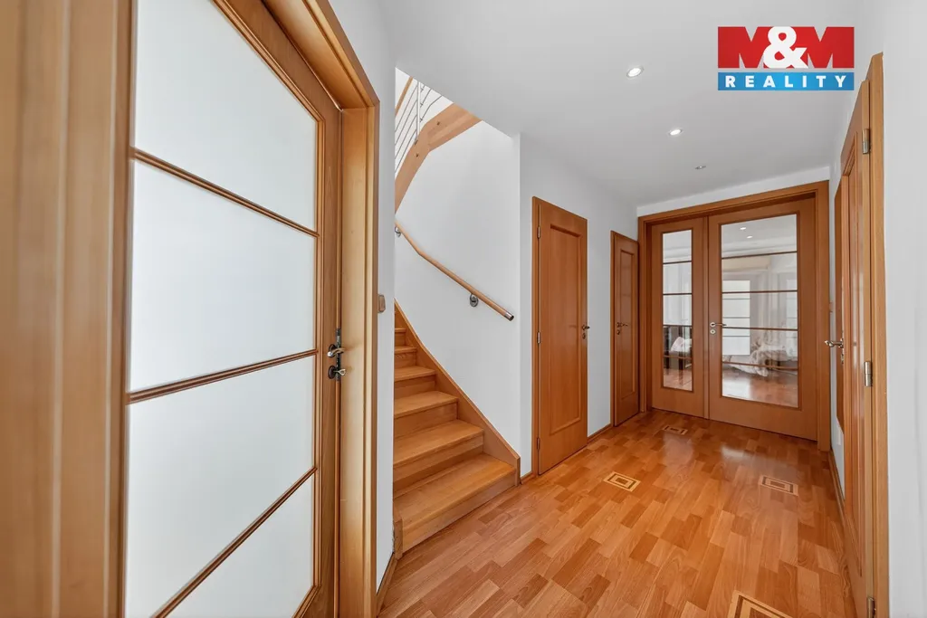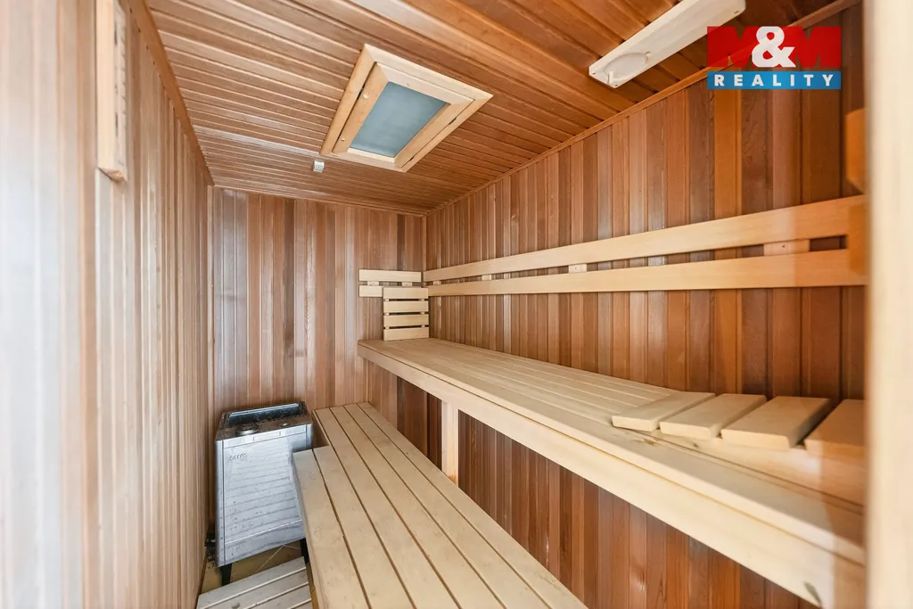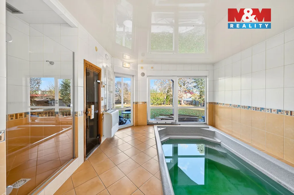Výraznou předností domu je vlastní wellness zóna. Vnitřní bazén s protiproudem a masážními tryskami umožňuje relaxaci po celý rok, sauna pak nabízí prostor pro skutečné zpomalení a odpočinek. Komfort bydlení podporují moderní technologie včetně rekuperace i praktické zázemí domu.