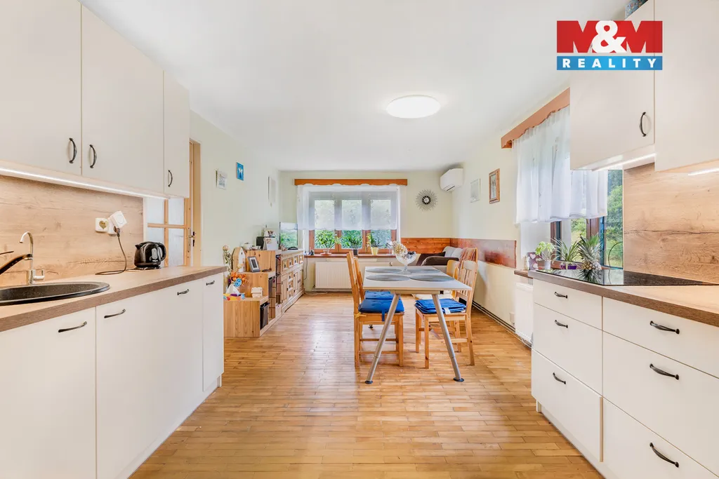 Dům po rekonstrukci v roce z 2022 nabízí moderní a úsporné bydlení s tepelným čerpadlem země–voda. Objekt je koncipován jako dva samostatné domy v jednom: hlavní 4+kk s vlastním vstupem poskytuje komfortní prostor pro rodinu, zatímco druhá část s odděleným vstupem zahrnuje tři pokoje a přízemí o rozloze 60 m² – ideální pro vícegenerační bydlení, kombinaci bydlení a podnikání, nebo jako samostatný podnikatelský prostor. Obě části propojuje vnitřní chodba, kterou lze zamknout z obou stran.