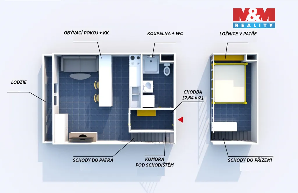 Rozdělení na denní a noční zónu dává bytu vzdušnost a pocit mnohem většího prostoru než u běžných garsonek.