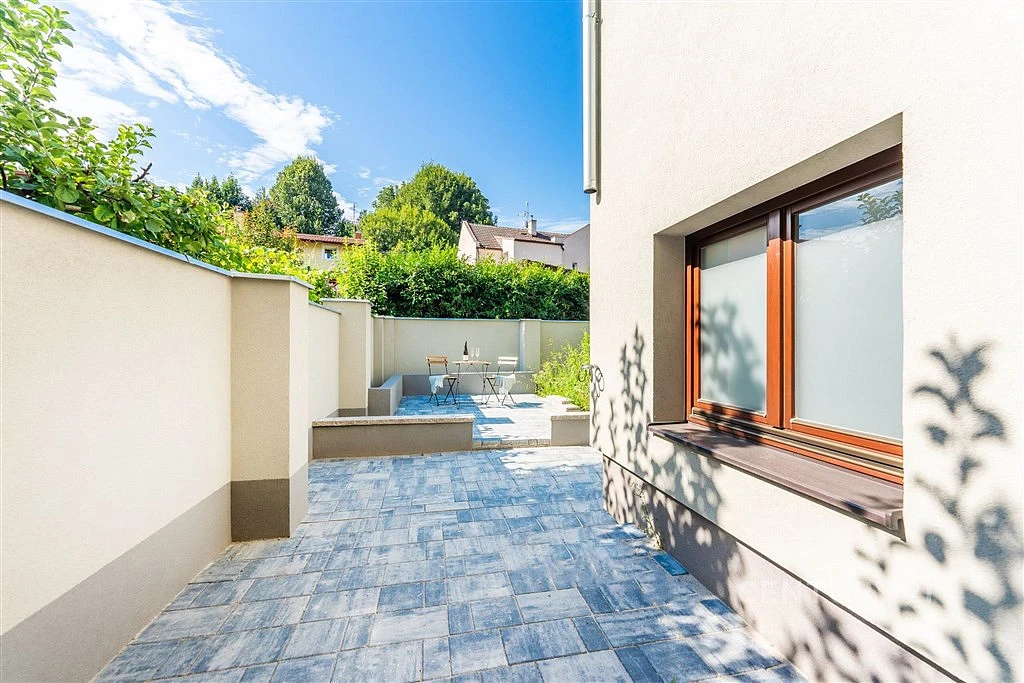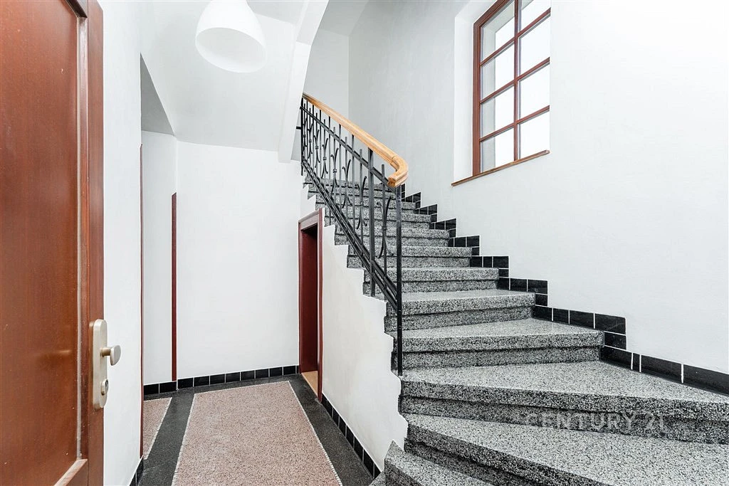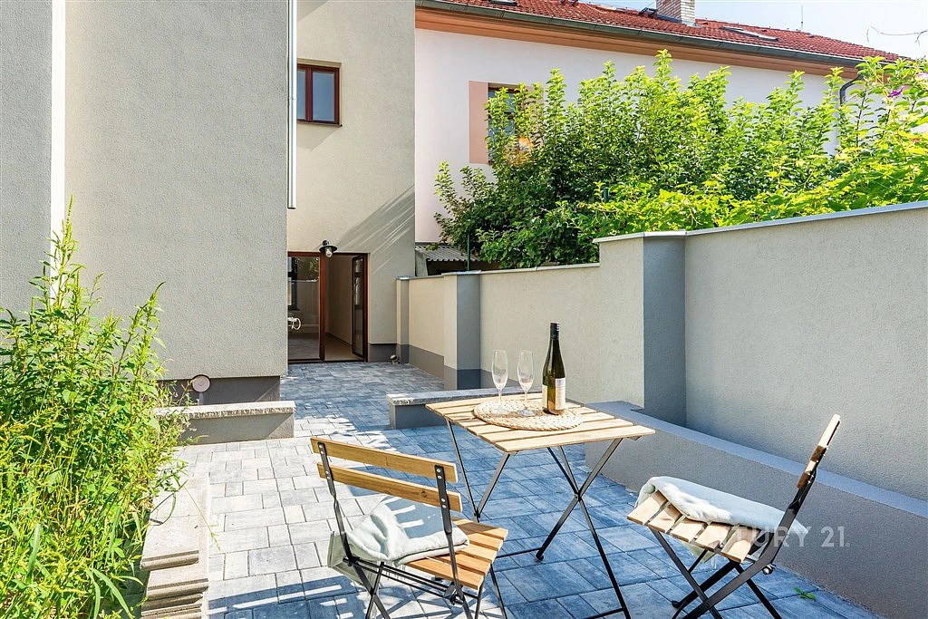 Dům je po rekonstrukci vnitřní i vnější, zateplený, s novou fasádou a střechou. Vznikly zde tři byty, z nichž pouze tento má svou soukromou terasu přístupnou z obývacího pokoje. Byt je kromě kuchyňské linky se spotřebiči nezařízený a je tedy jen na vás, jaký účel obytným místnostem dáte a zda budete mít dispozici 2+1 nebo 3+kk. Toaleta je samostatná, v koupelně s oknem je vana. Z chodby domu je vstup do sklepa.