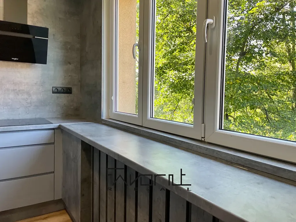 V kuchyni je nová kuchyňská linka na míru od stolaře včetně vestavěných spotřebičů (lednice, pračka, digestoř, myčka, MVT, elektrická varná deska, elektrická trouba).