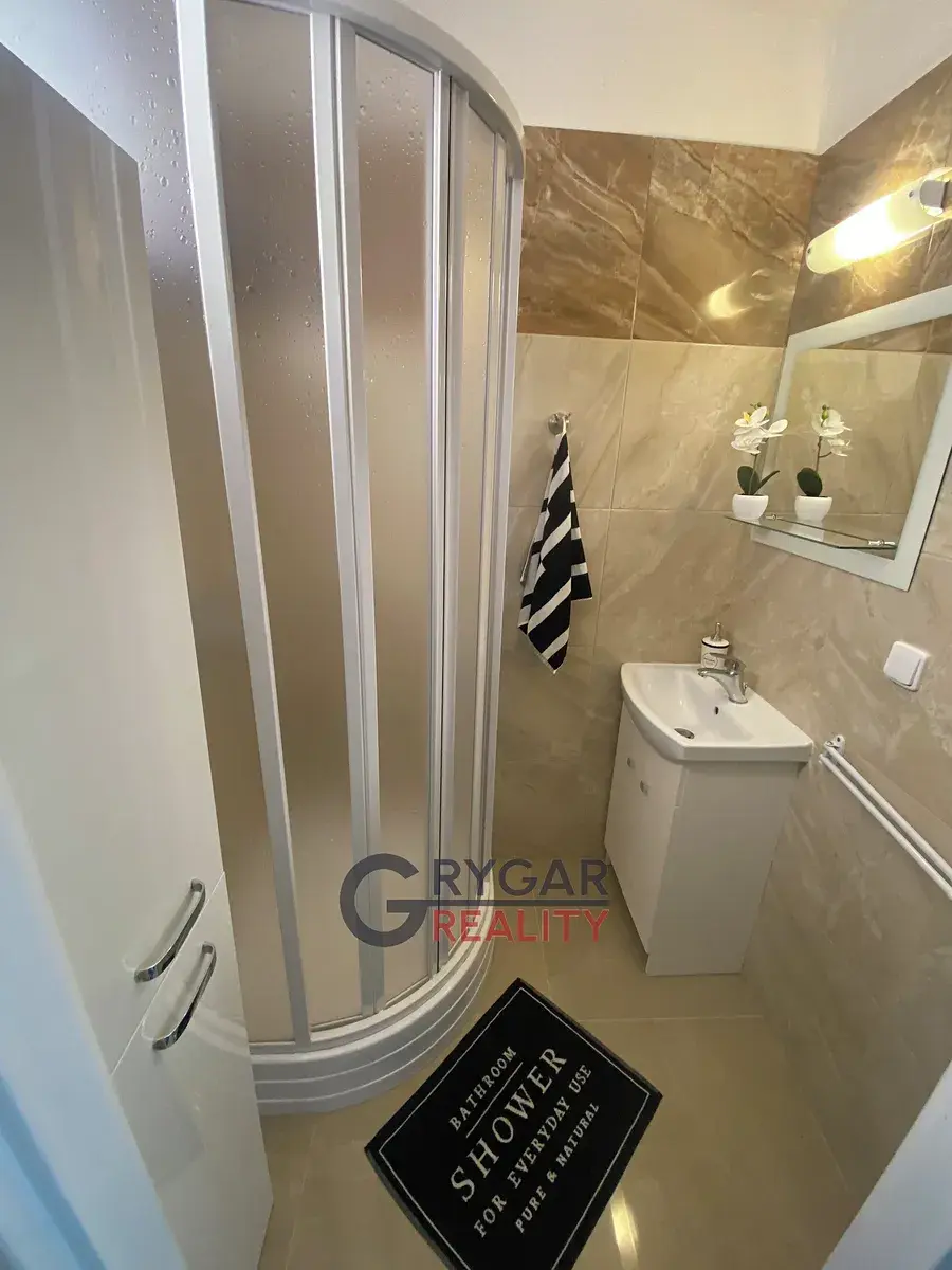 Dispozice bytu: vstupní chodba (3,66 m2), vlevo samost. WC (1,10 m2), vedle koupelna (2,04 m2) se sprchovým koutem, umyvadlem, skříňkou a přípravou pro pračku.