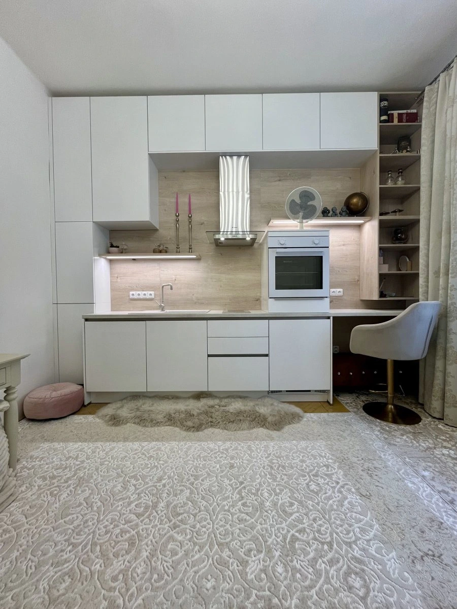 ✅ Stylová kuchyňská linka s kvalitními spotřebiči (elektrická trouba, indukční varná deska, digestoř, lednice) a spoustou úložného prostoru