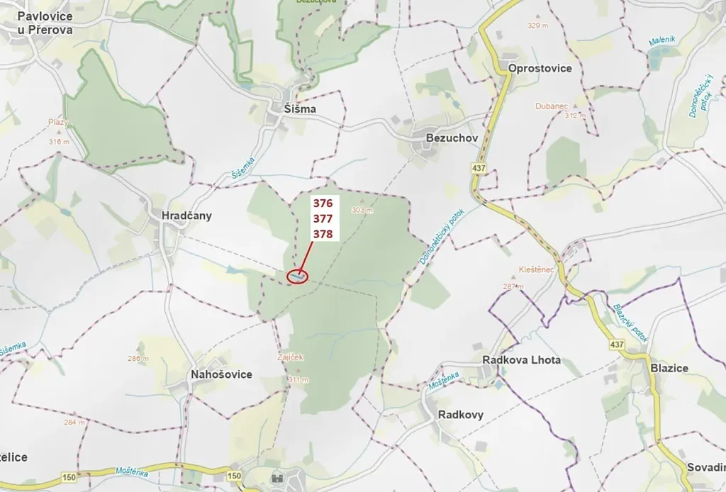 Lesní pozemky o výměře 1703 m2, parcelní čísla 376, 377, 378, podíl 1/1, katastrální území Hradčany na Moravě, obec Hradčany, obec s rozšířenou působností Přerov, okres Přerov, Olomoucký kraj. Po těžbě.