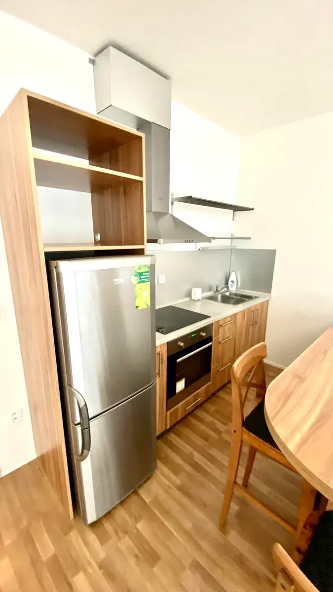 Byt je nově vybaven kuch.linkou s barpultem a 2 židlemi, značkové spotřebiče třídy A+ (sklovaná deska, el.trouba, digestoř, velká lednice s mrazákem, pračka), vybavená koupelna se sprchovým koutem, v předsíni velká vestavěná skříň, v pokoji paletová dvoj-postel (možno odstranit). K dispozici také žehlící prkno, sušák na prádlo a další 3 plastové židle.
