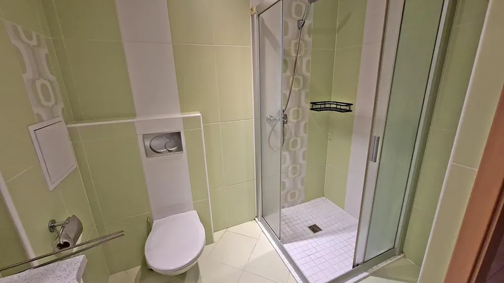 Výhodou bytu je prostorná šatna s posuvnými zrcadlovými dveřmi a velká zděná koupelna s bezproblémovým místem pro pračku.
