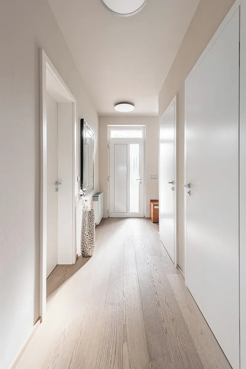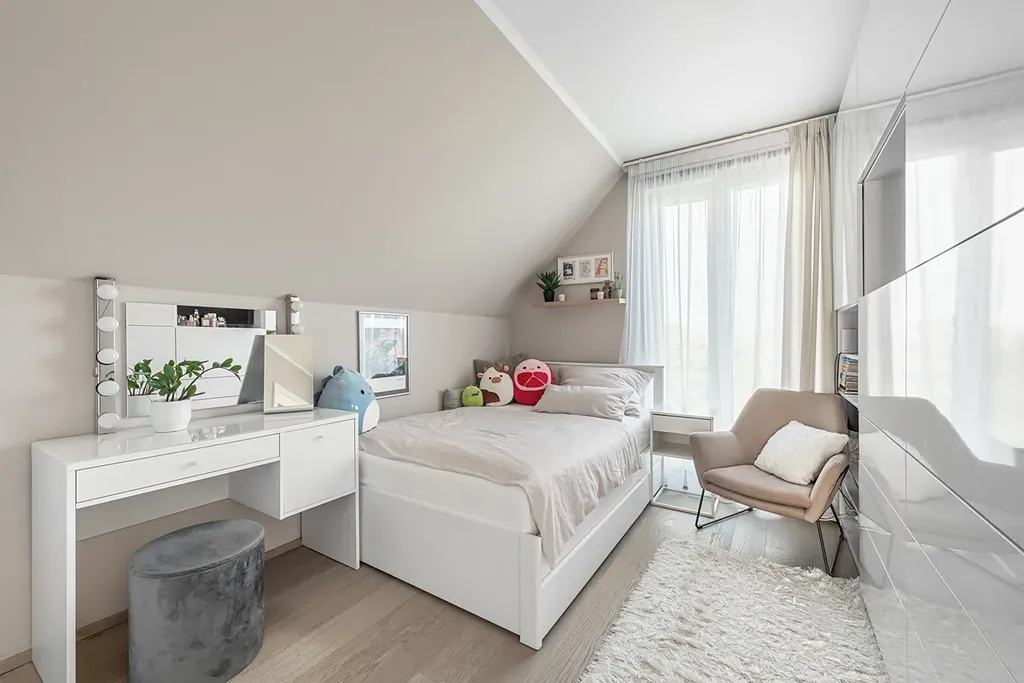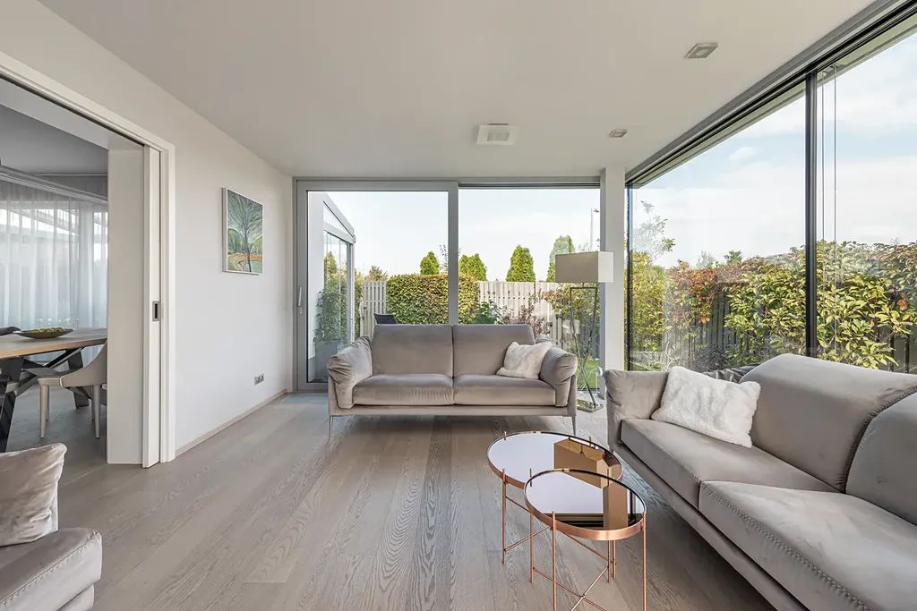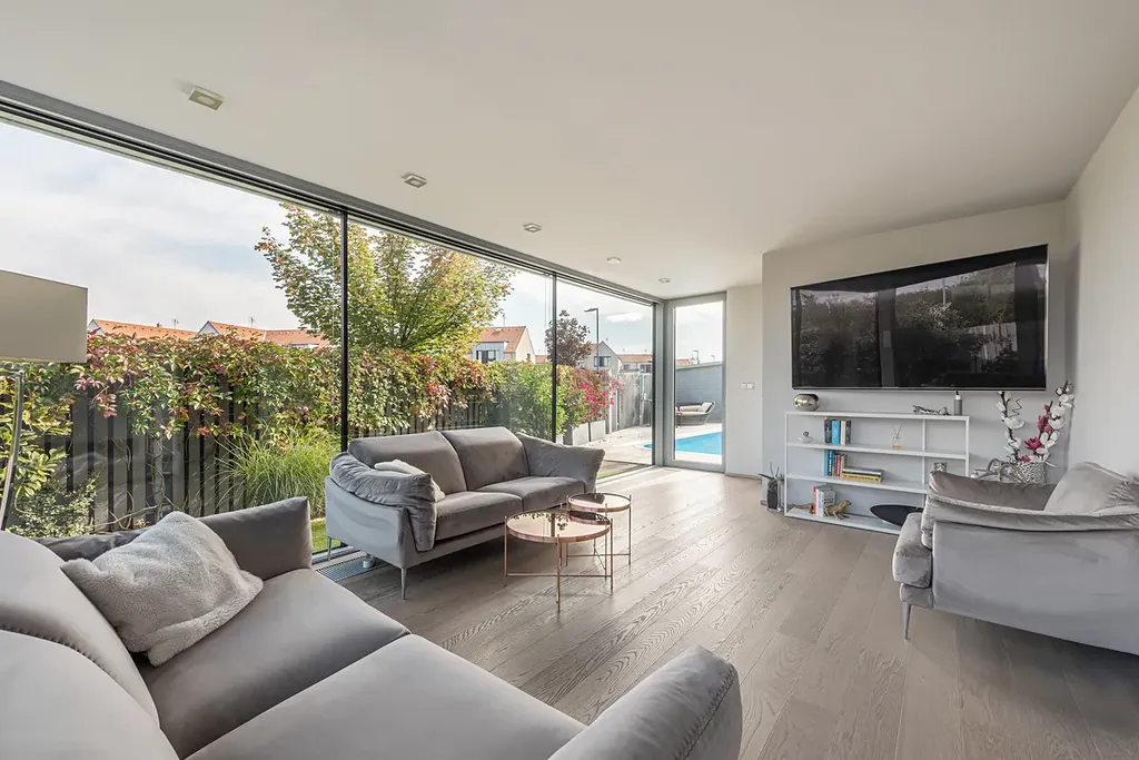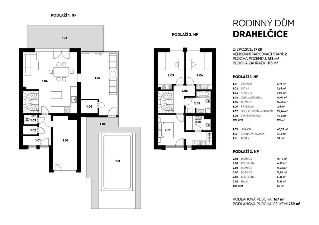 Nadstandardní rodinný dům o dispozici 7+kk a užitné ploše 167 m² se nachází v klidné rezidenční části obce Drahelčice, pouhých několik minut od Prahy. Nemovitost nabízí harmonické propojení moderní architektury, precizního zpracování a komfortu rodinného bydlení s důrazem na detail, funkčnost i estetiku. Dominantou přízemí je světlý obývací pokoj s krbem a kuchyní vybavenou spotřebiči Miele a vinotékou, plynule navazující na zimní zahradu a společenskou místnost s celoskleněnými stěnami, které otevírají interiér do pečlivě udržované zahrady. Součástí přízemí je dále vstupní hala s šatnou a vestavěnými skříněmi, toaleta, ložnice a samostatná prádelna. Elegantní dřevěné schodiště s nerezovým zábradlím vede do patra, kde se nachází hlavní ložnice s vlastní koupelnou, dva dětské pokoje a druhá koupelna s vanou a dvojumyvadlem. K vysokému standardu vybavení patří dřevěné podlahy v dekoru šedého dubu, bezfalcové dveře v bílém laku, hliníková a plastová okna s trojsklem, designové koupelny s italskou keramikou a sanitou Hansgrohe, venkovní žaluzie a vytápění kombinující podlahové topení, konvektory a radiátory s plynovým kotlem. Komfortní zázemí této výjimečné nemovitosti doplňují venkovní terasy z exotického dřeva massaranduba, vyhřívaný bazén se slanou vodou (8×4 m) s protiproudem a zastřešením, elektricky ovládaná posuvná brána, zahradní domek a dvě venkovní parkovací stání na zpevněné ploše před domem. Pečlivě udržovaná zahrada nabízí maximální soukromí, klid a příjemné posezení. Drahelčice jsou oblíbenou rezidenční lokalitou s rychlým spojením do Prahy a plnou občanskou vybaveností. V blízkosti se nachází mateřská a základní škola, sportoviště, restaurace, dětská hřiště i přírodní okolí vhodné pro rekreaci. Do centra Prahy se pohodlně dostanete autem do 20 minut nebo MHD – zastávka je v docházkové vzdálenosti.